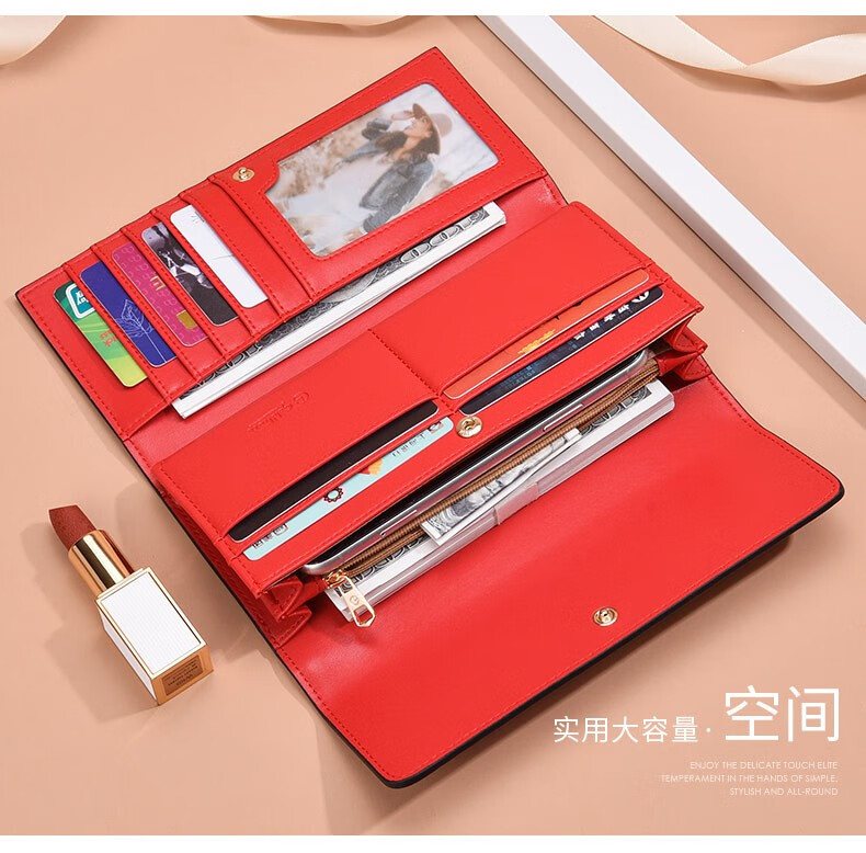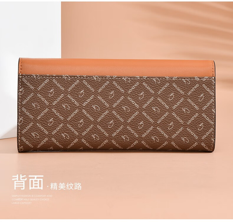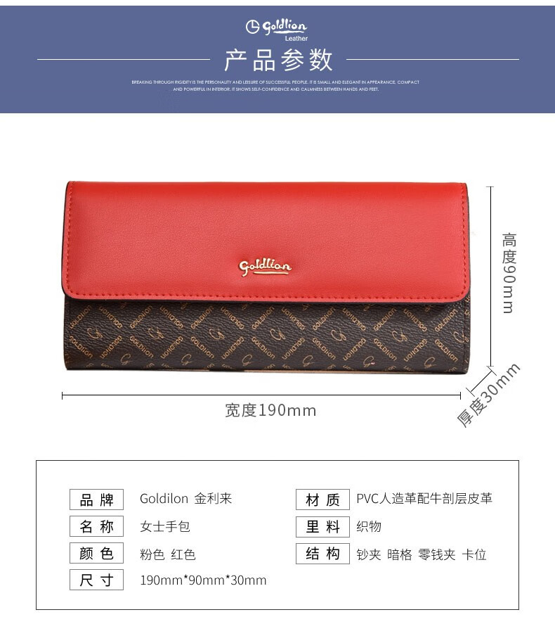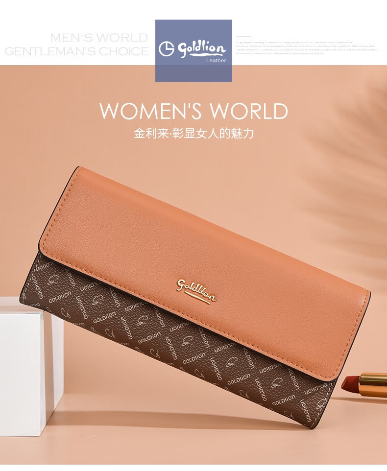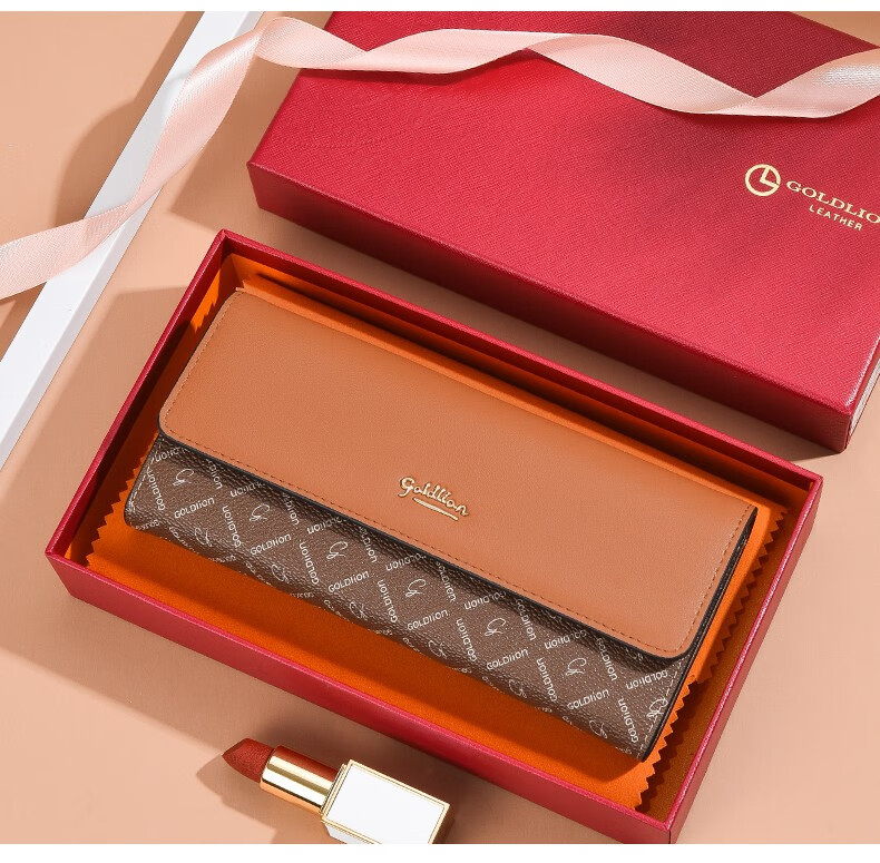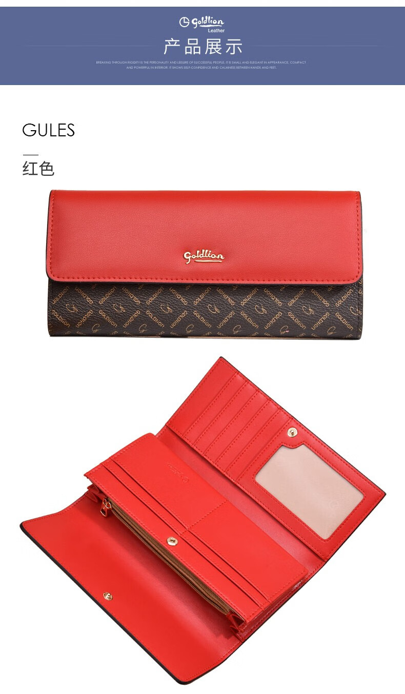 Goldlion Long Wallet Women's New Fashion Genuine Leather Handbag Three-fold Clutch Bag Clutch Bag Women's Luxury High-end Brand Get a fake one and get ten for free Official straight hair red