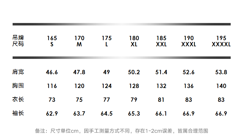 China (cm) 165 / 88-90 170 / 96-98 175 / 108-110 180 / 118-122 185 / 126-130