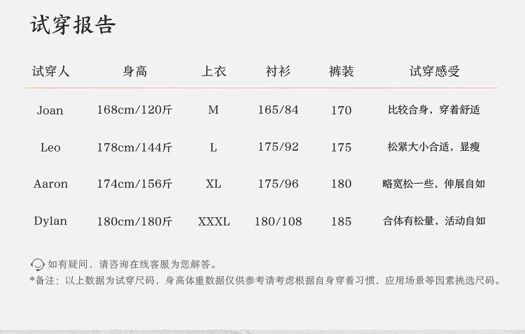 China (cm) 165 / 88-90 170 / 96-98 175 / 108-110 180 / 118-122 185 / 126-130