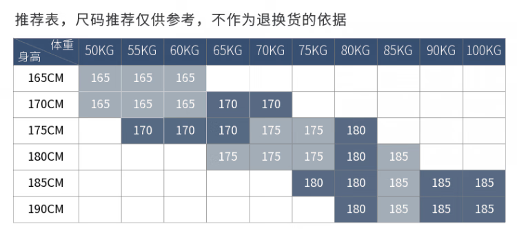 China (cm) 165 / 88-90 170 / 96-98 175 / 108-110 180 / 118-122 185 / 126-130