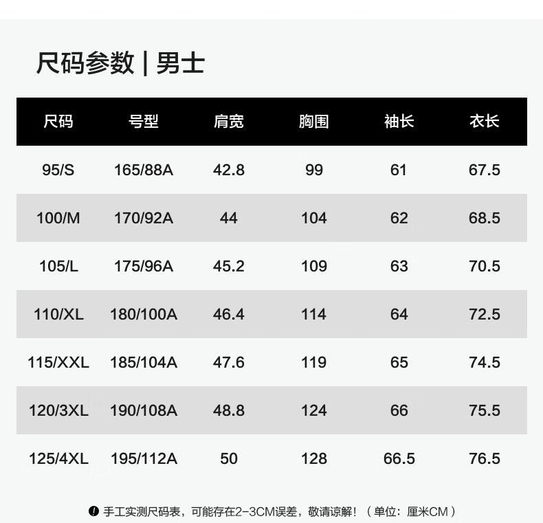 China (cm) 165 / 88-90 170 / 96-98 175 / 108-110 180 / 118-122 185 / 126-130