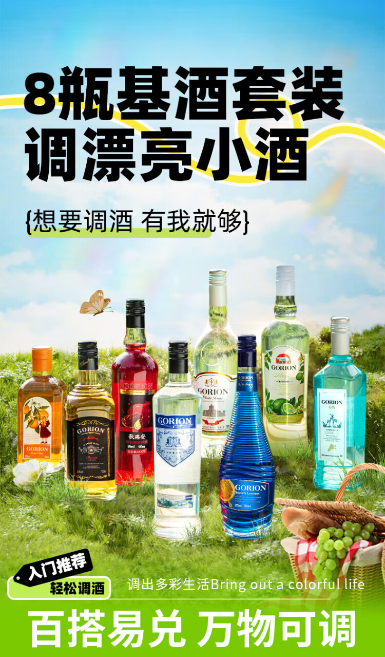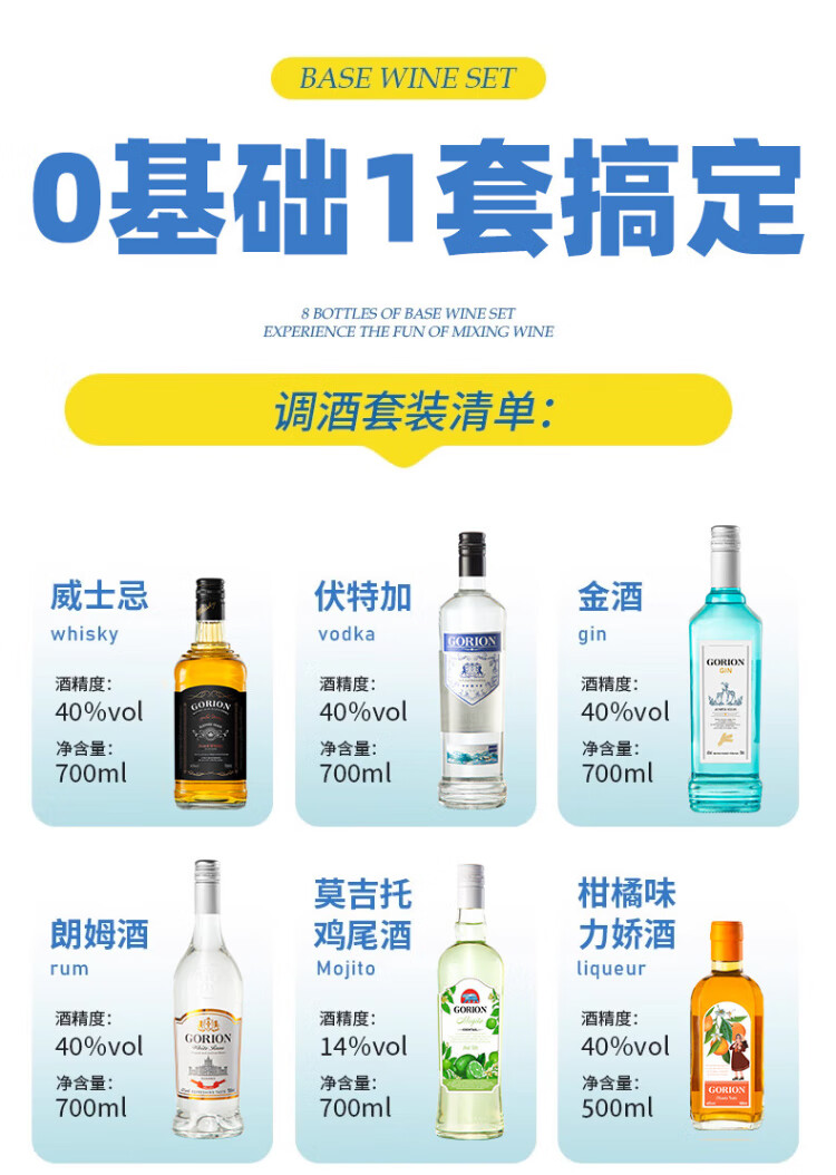 Gorian whiskey vodka gin rum liqueur cocktail wine base 8-pack set with free bartending tools