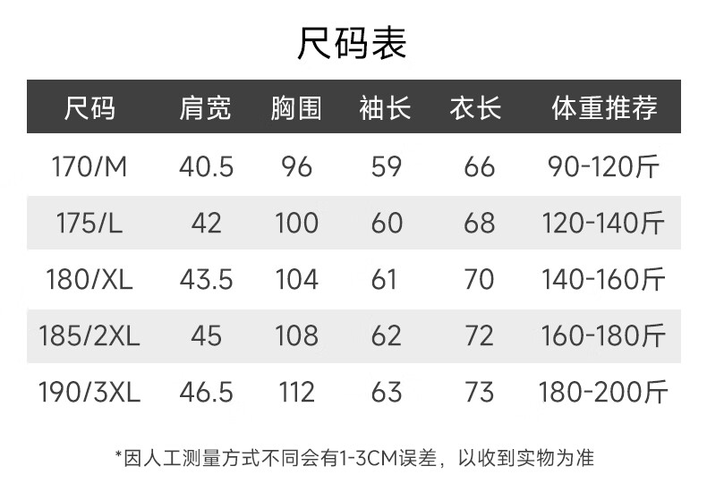China (cm) 165 / 88-90 170 / 96-98 175 / 108-110 180 / 118-122 185 / 126-130