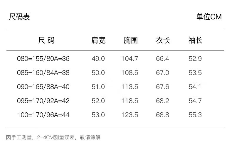 China (cm) 160-165/84-86 165-170 / 88-90 167-172 / 92-96 168-173 / 98-102 170-176 / 106-110