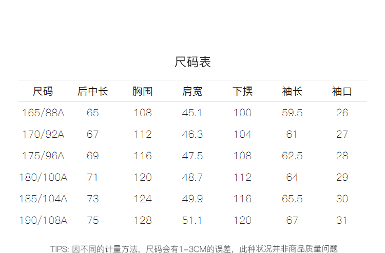 China (cm) 160-165/84-86 165-170 / 88-90 167-172 / 92-96 168-173 / 98-102 170-176 / 106-110