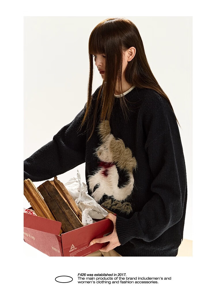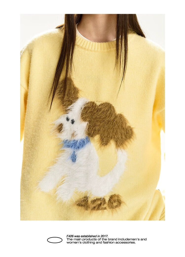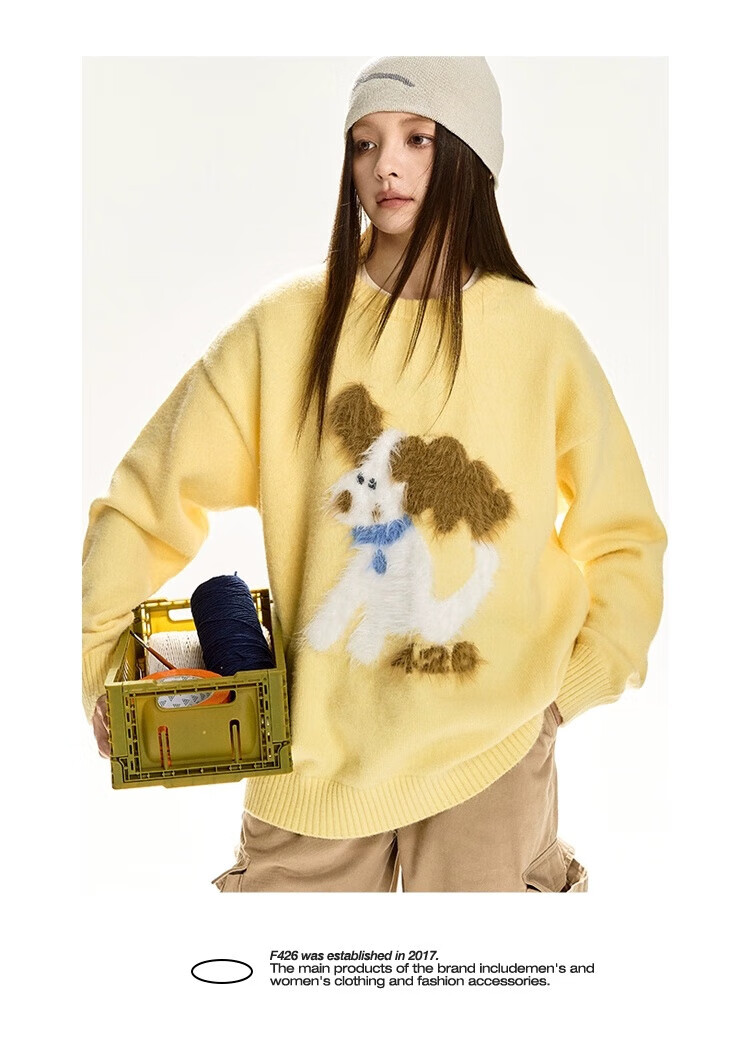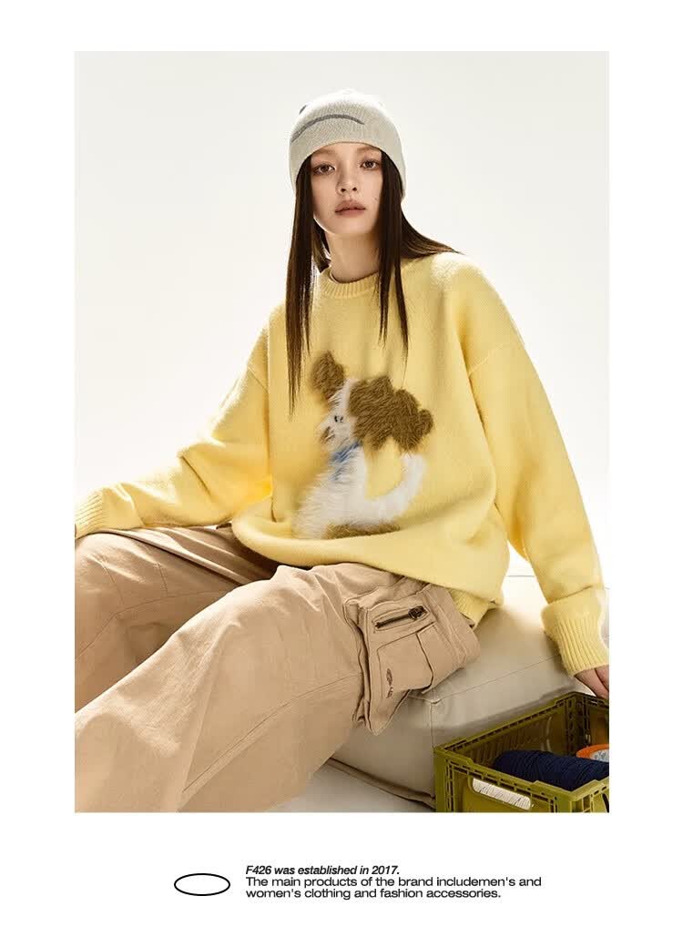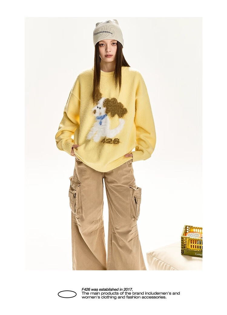 F426官方店国潮牌情侣休闲宽松时尚毛绒小狗提花毛衣 黄色 S
