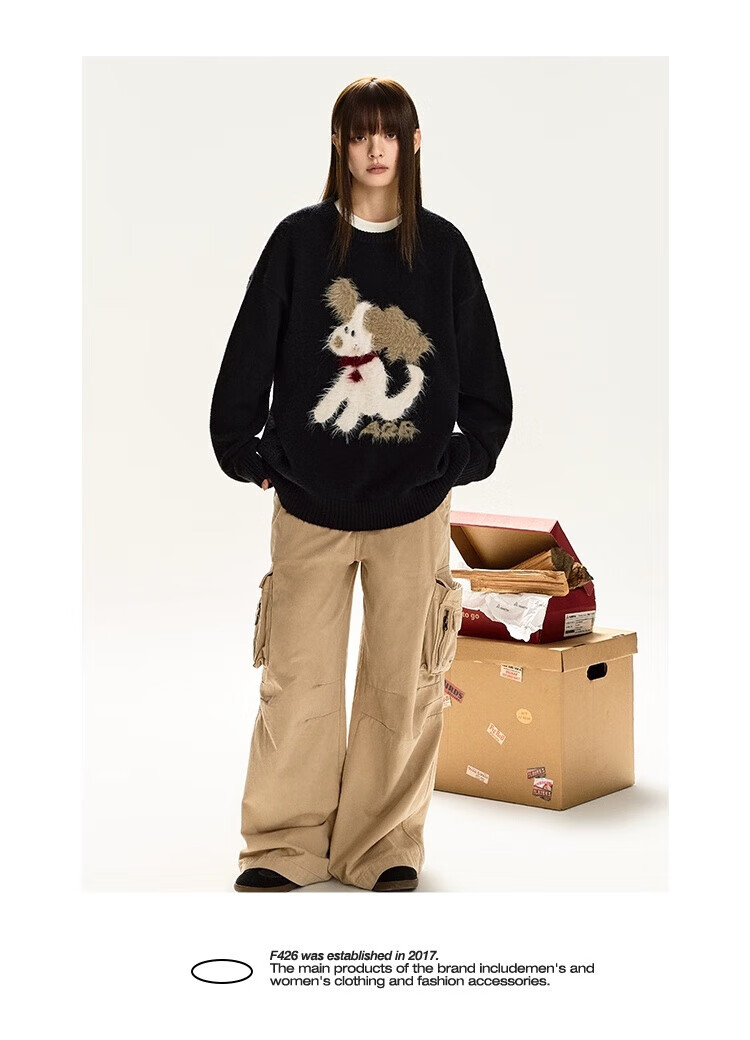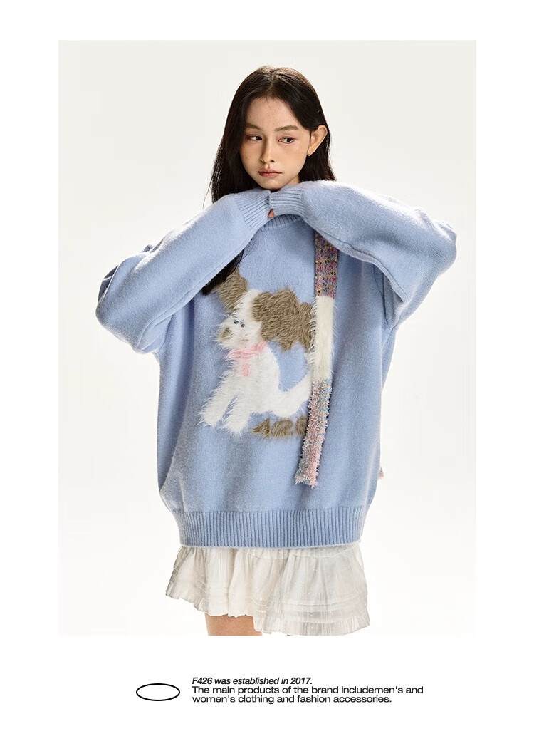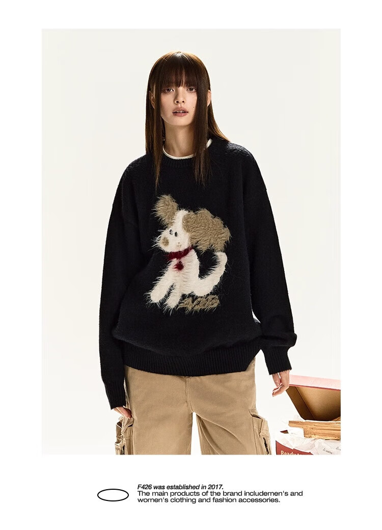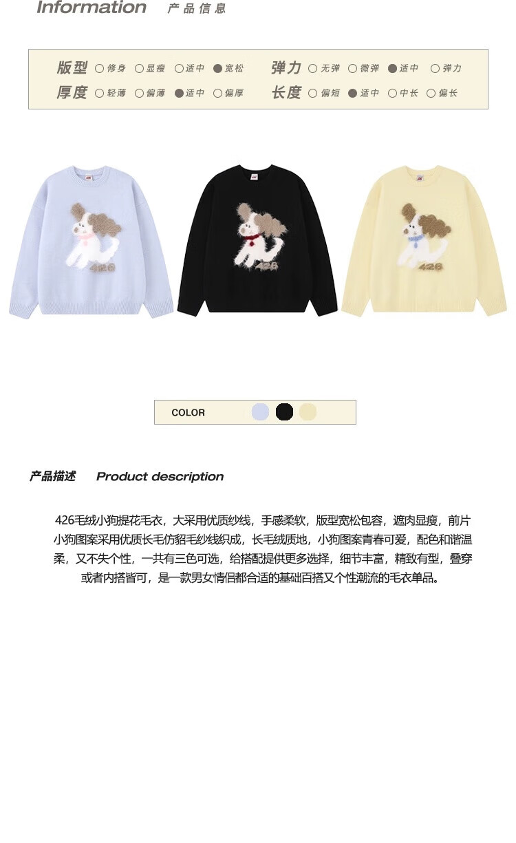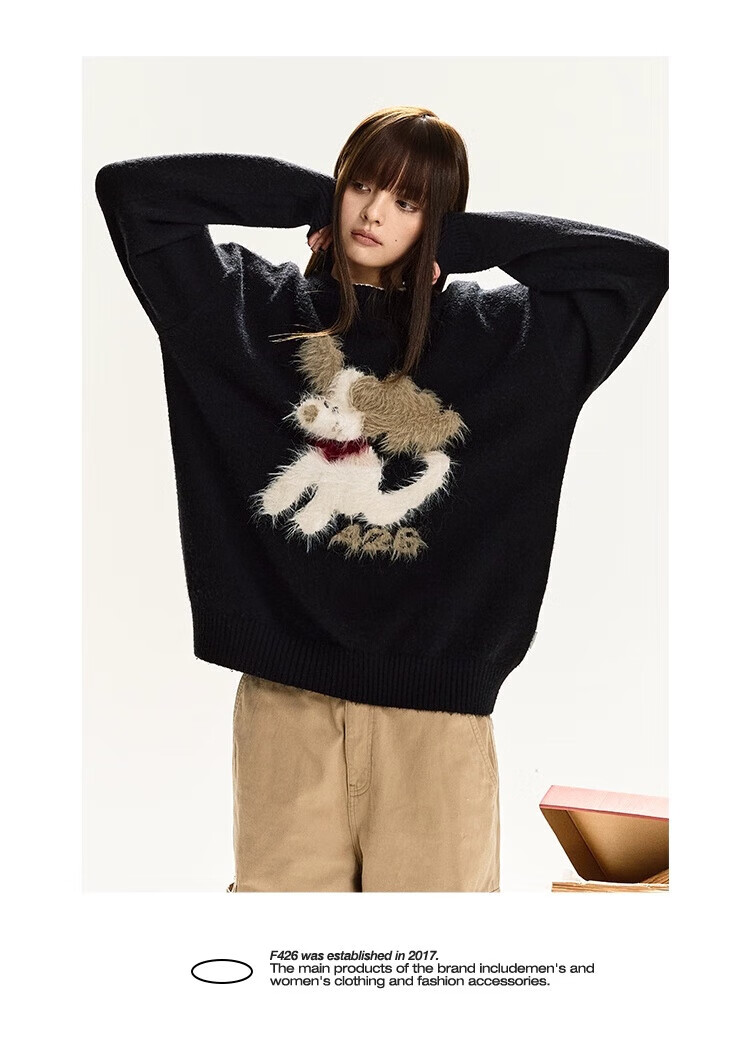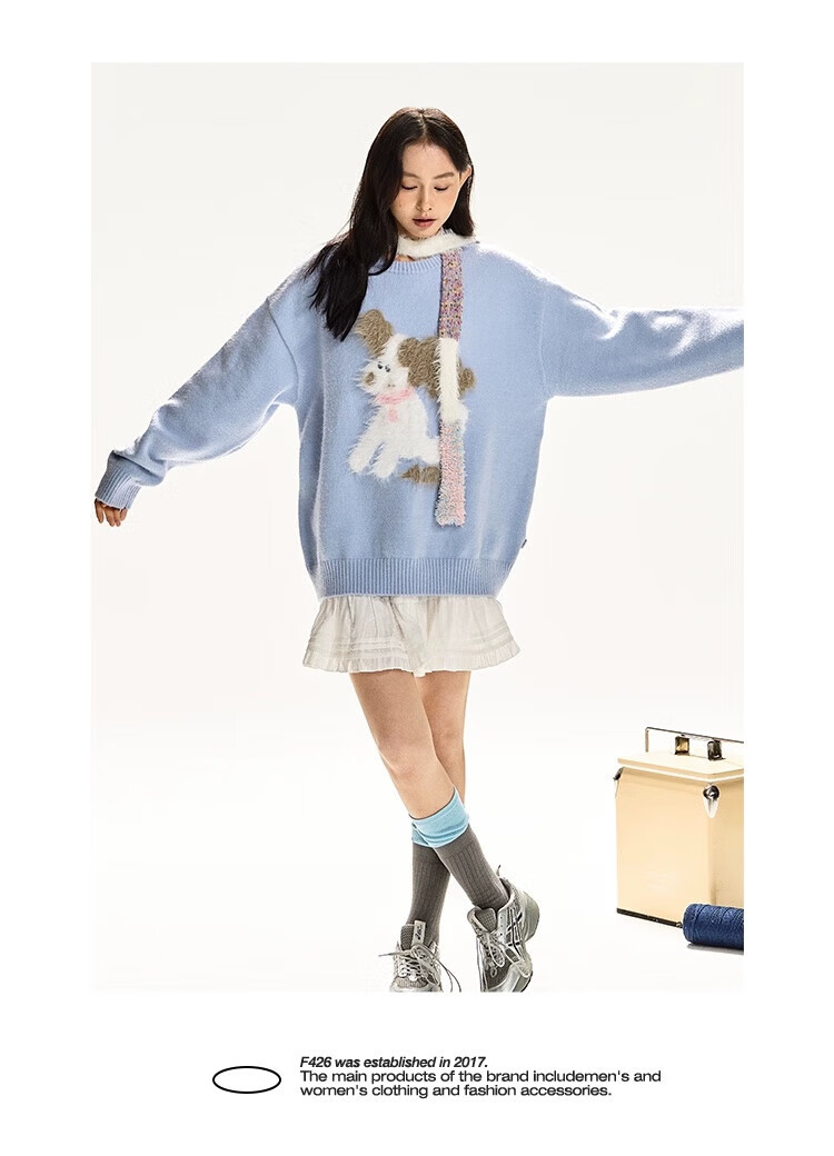 F426官方店国潮牌情侣休闲宽松时尚毛绒小狗提花毛衣 黄色 S