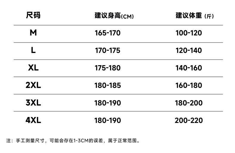 China (cm) 165 / 88-90 170 / 96-98 175 / 108-110 180 / 118-122 185 / 126-130