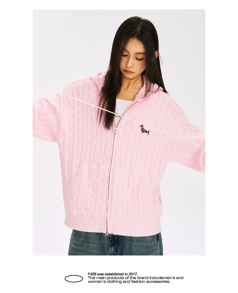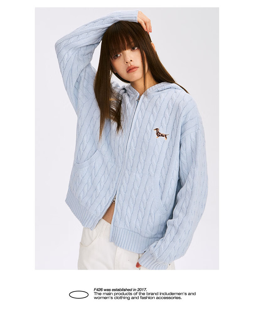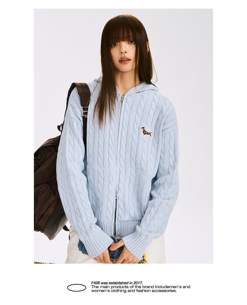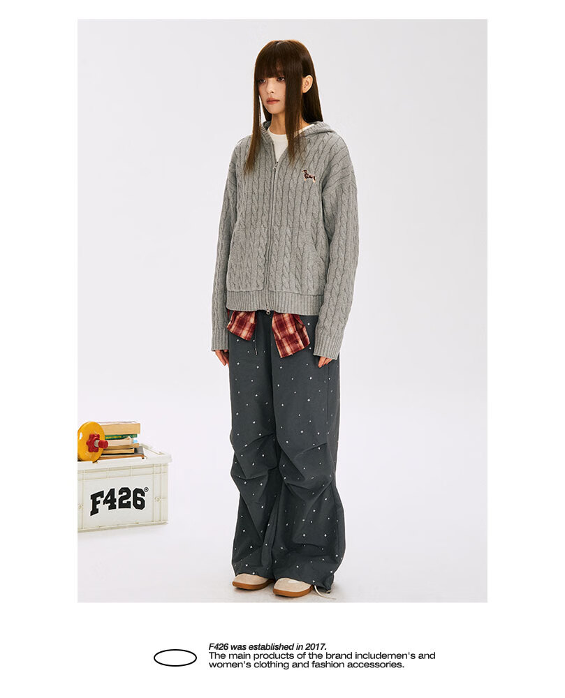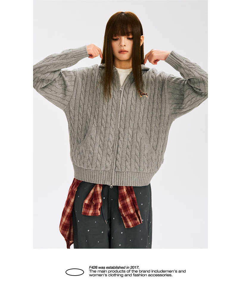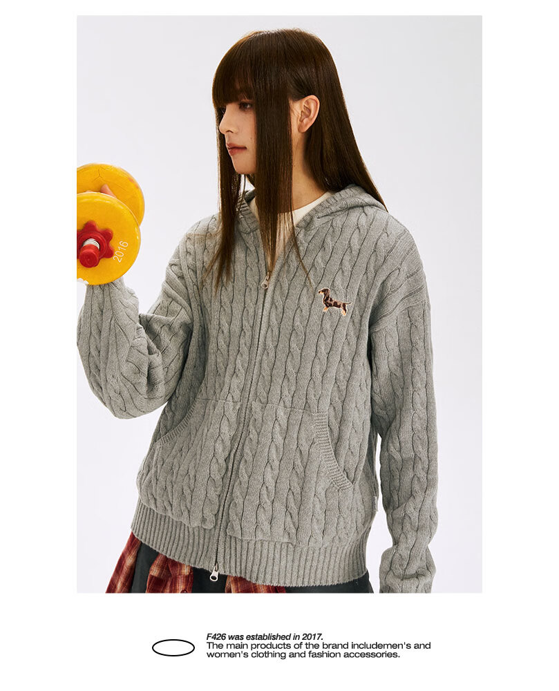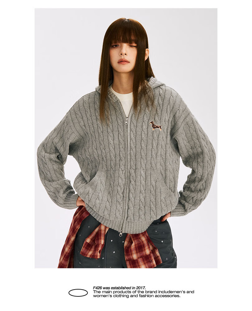 F426 official store national fashion brand autumn new casual loose retro twist hooded cardigan sweater flower gray L