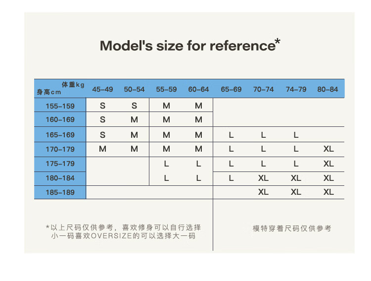 China (cm) 160-165/84-86 165-170 / 88-90 167-172 / 92-96 168-173 / 98-102 170-176 / 106-110