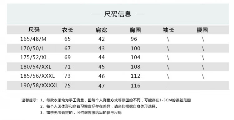 China (cm) 160-165/84-86 165-170 / 88-90 167-172 / 92-96 168-173 / 98-102 170-176 / 106-110