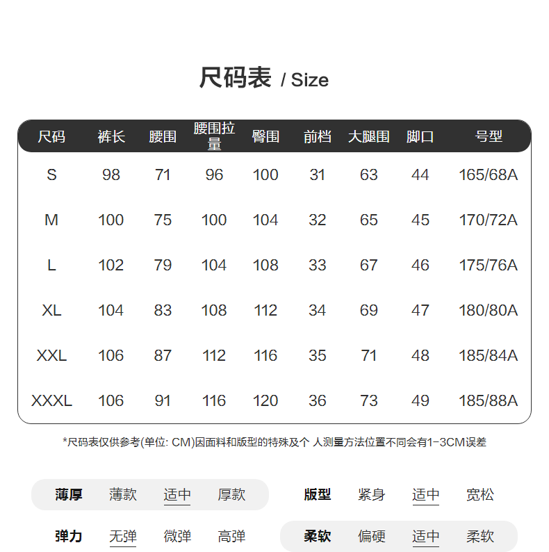 Outseam (cm) 99 cm 101.5 cm 104 cm 106.5 cm 109 cm