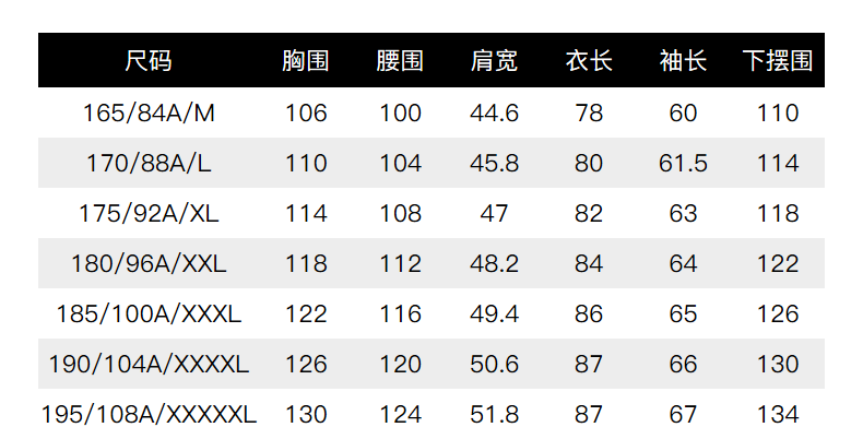 China (cm) 160-165/84-86 165-170 / 88-90 167-172 / 92-96 168-173 / 98-102 170-176 / 106-110