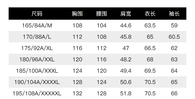 China (cm) 165 / 88-90 170 / 96-98 175 / 108-110 180 / 118-122 185 / 126-130