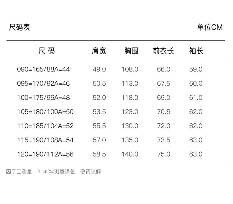 China (cm) 165 / 88-90 170 / 96-98 175 / 108-110 180 / 118-122 185 / 126-130