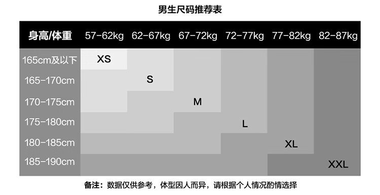 China (cm) 165 / 88-90 170 / 96-98 175 / 108-110 180 / 118-122 185 / 126-130