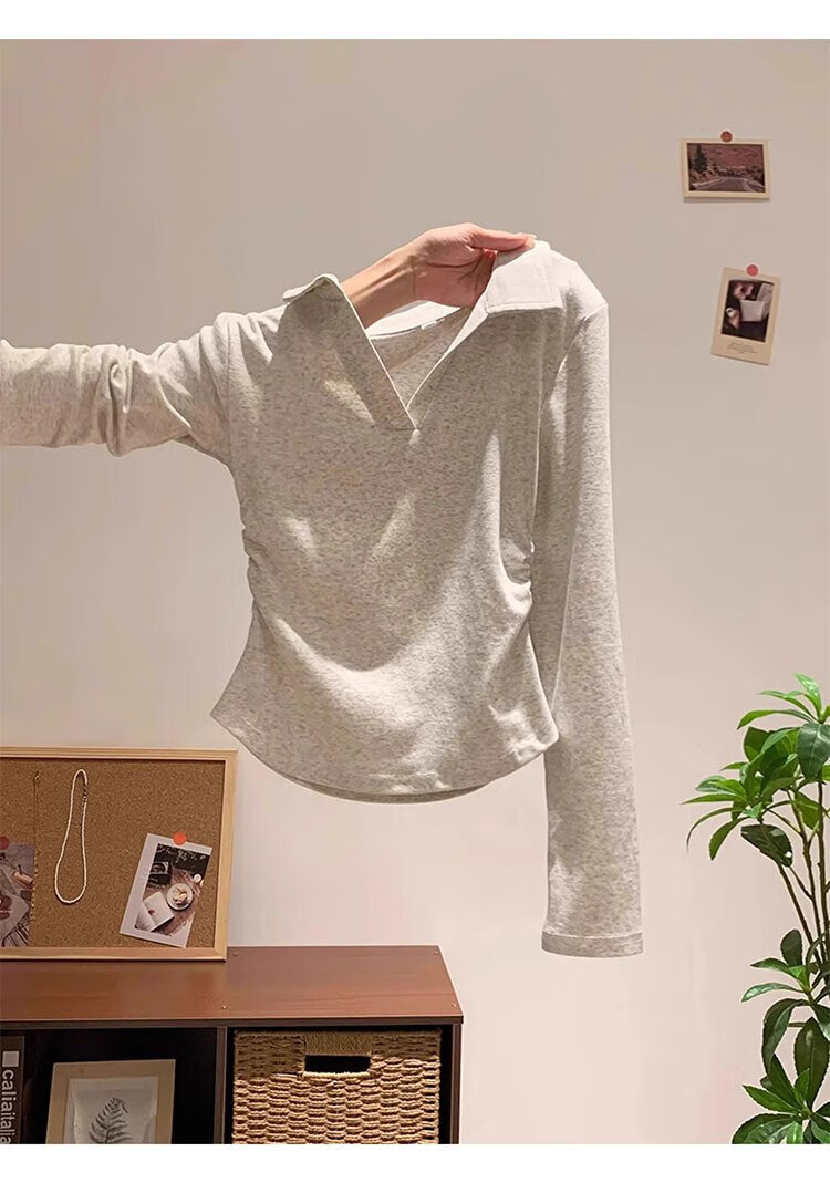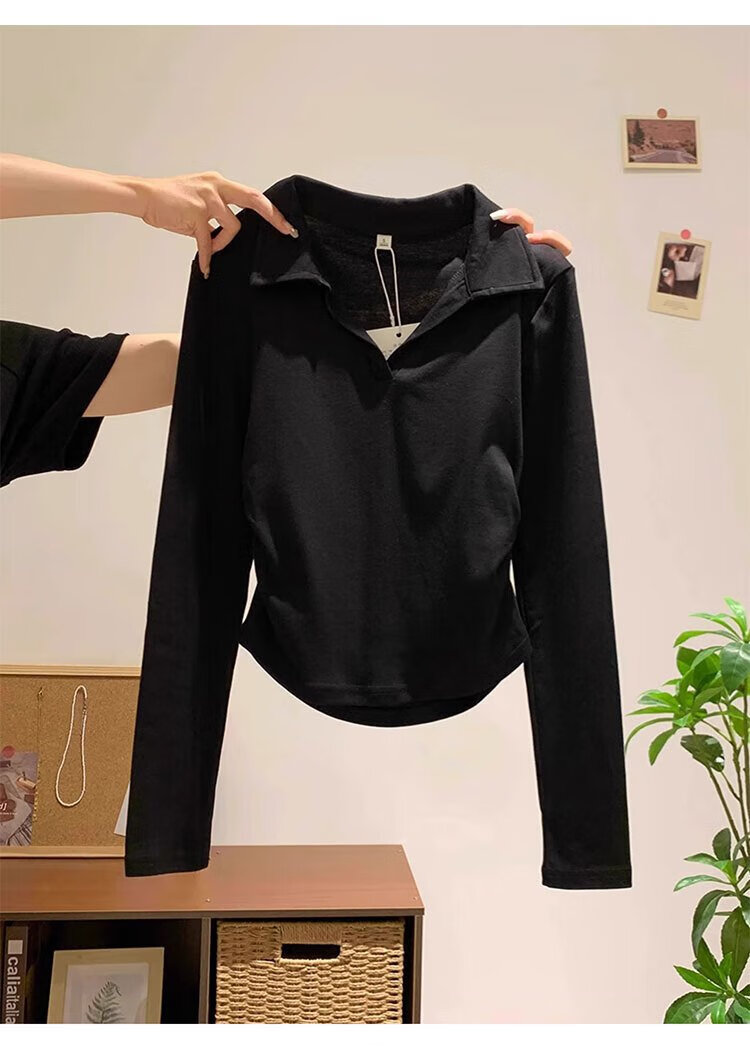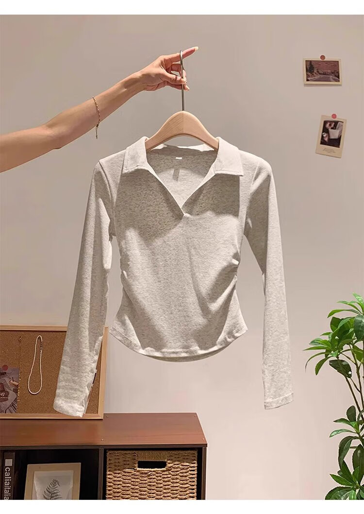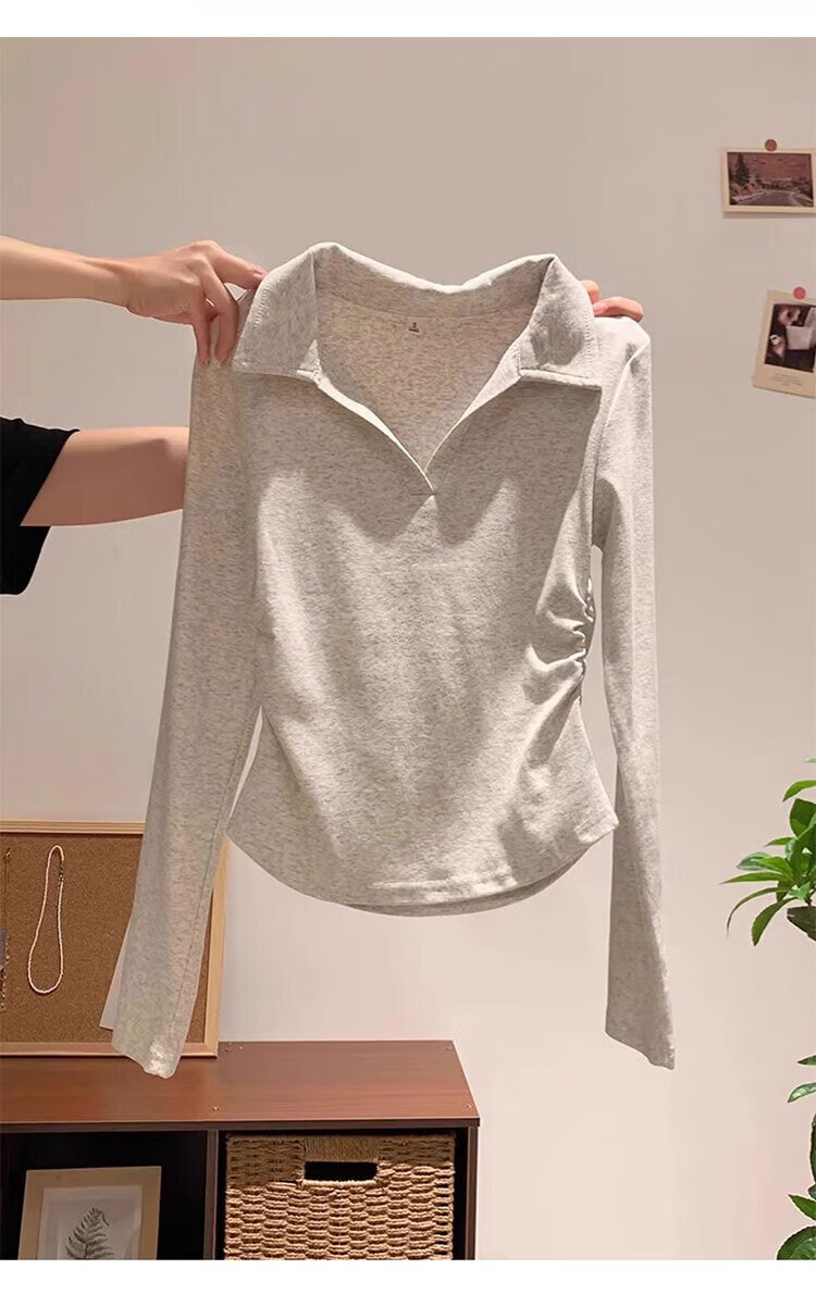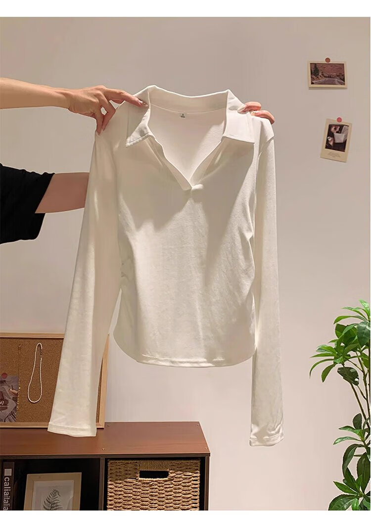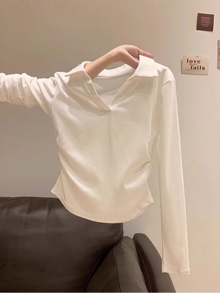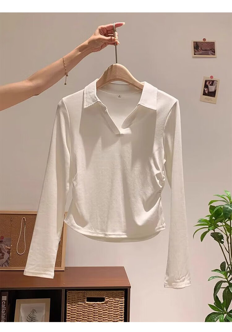Woodpecker polo collar pure cotton right shoulder long sleeve t-shirt women's autumn new pleated waist bottoming shirt top white XL