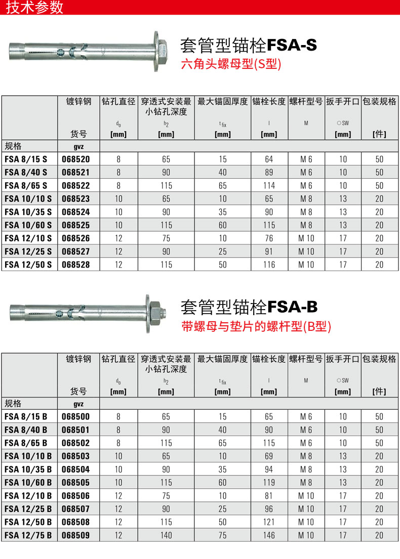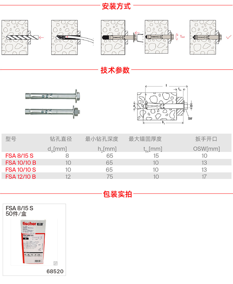 Metal anchor expansion bolt fischer fischer German FSA-S casing hexagonal head concrete solid brick special original imported handrail ladder door ground fixing FSA8X60/15S 1 piece 68520