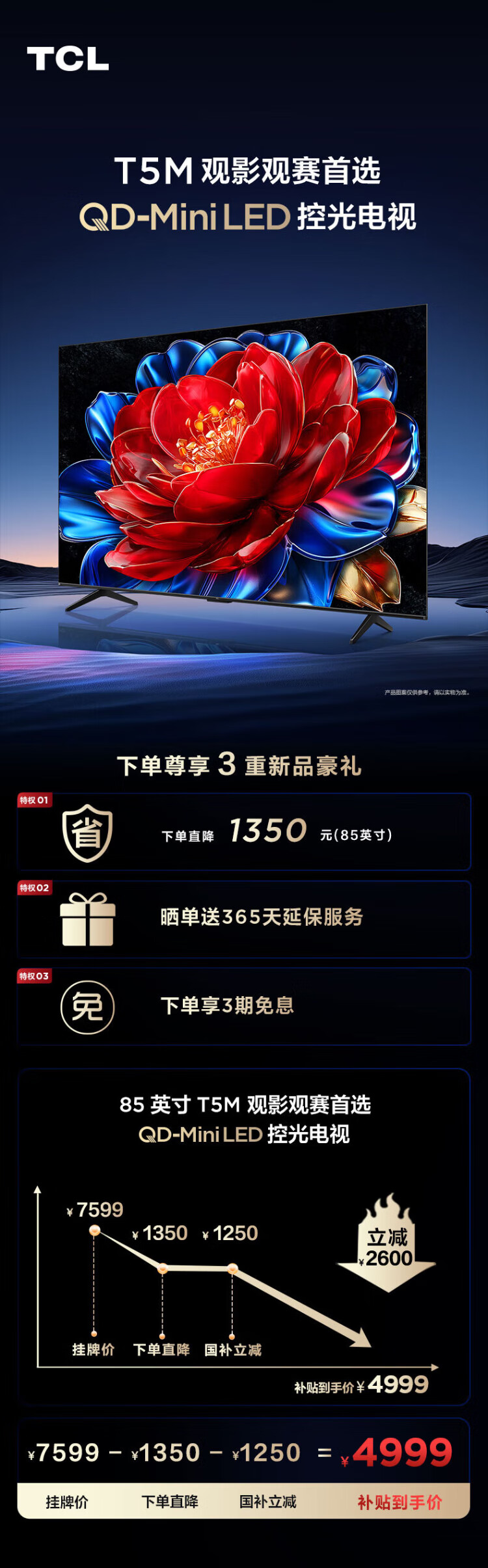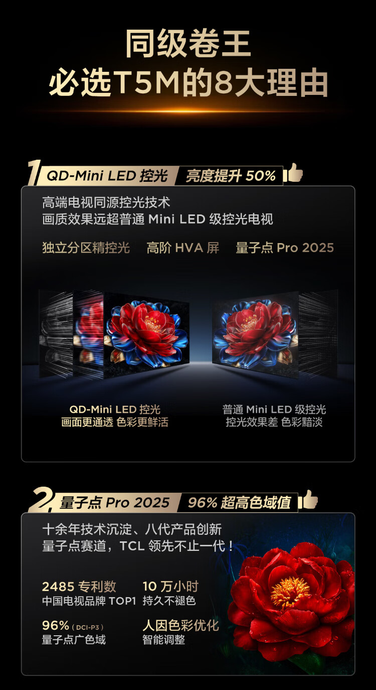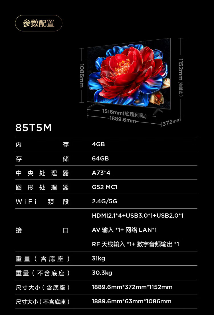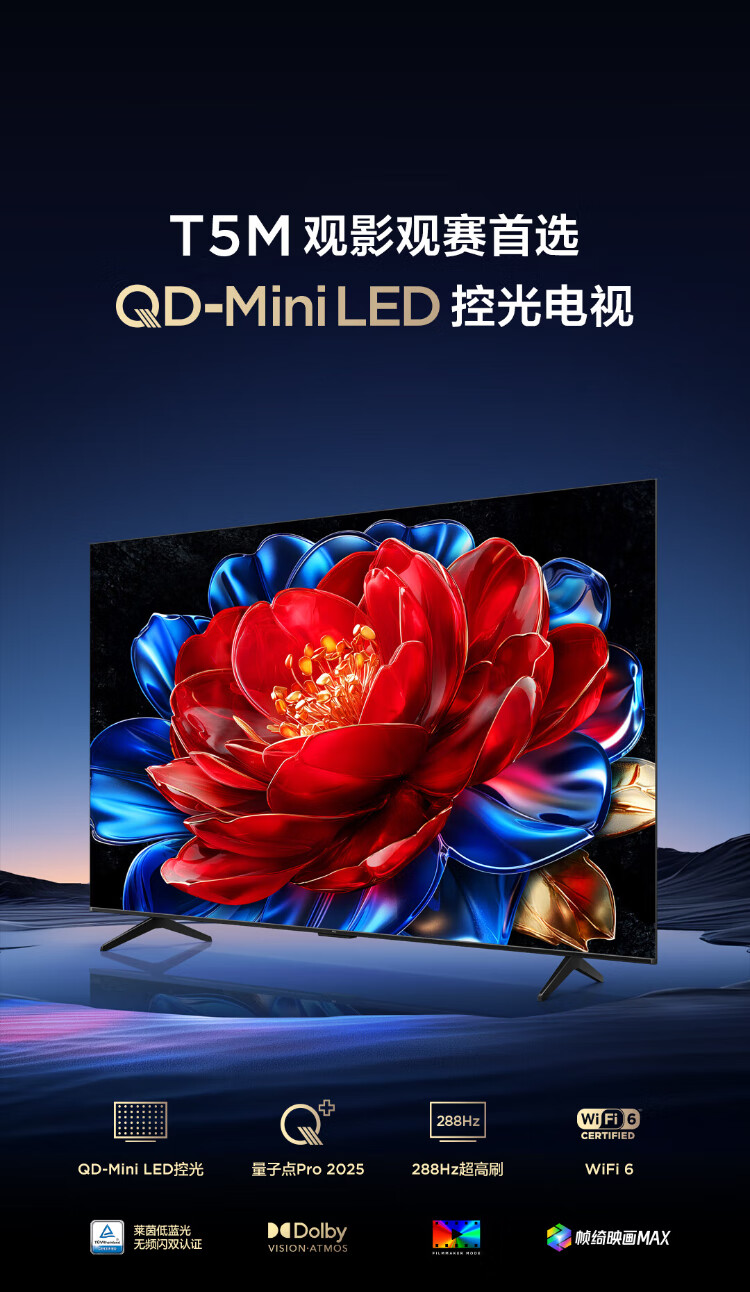 TCL TV 85T5M 85-inch QD-Mini LED light control 288Hz high brush QLED quantum dot WiFi6 ultra-thin state subsidy