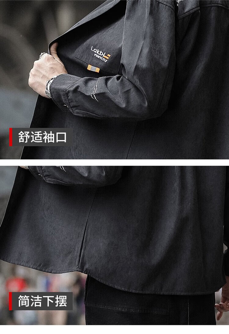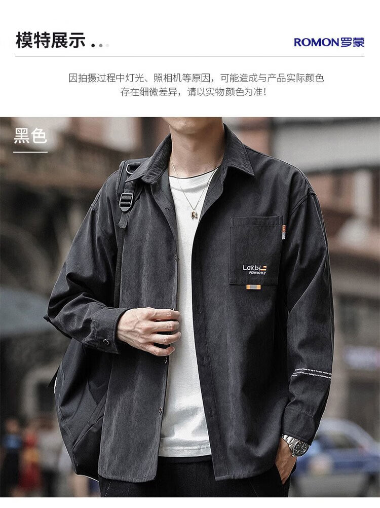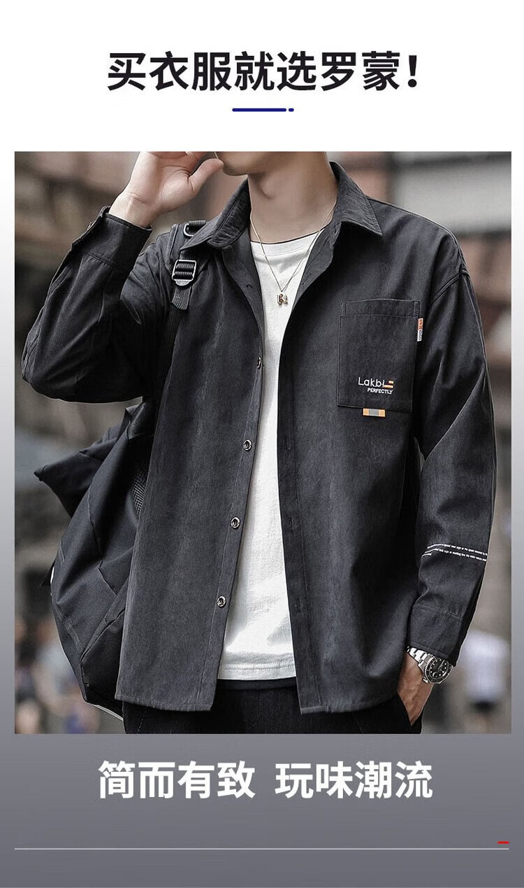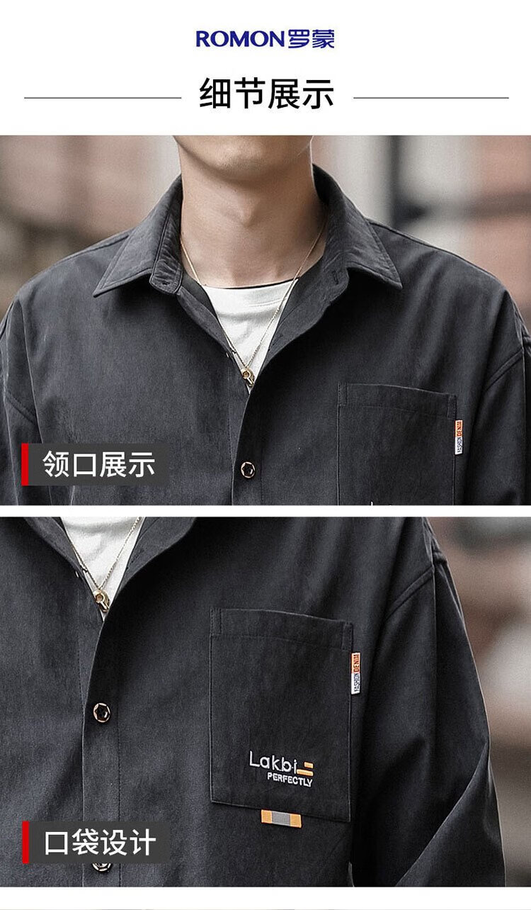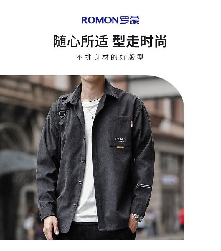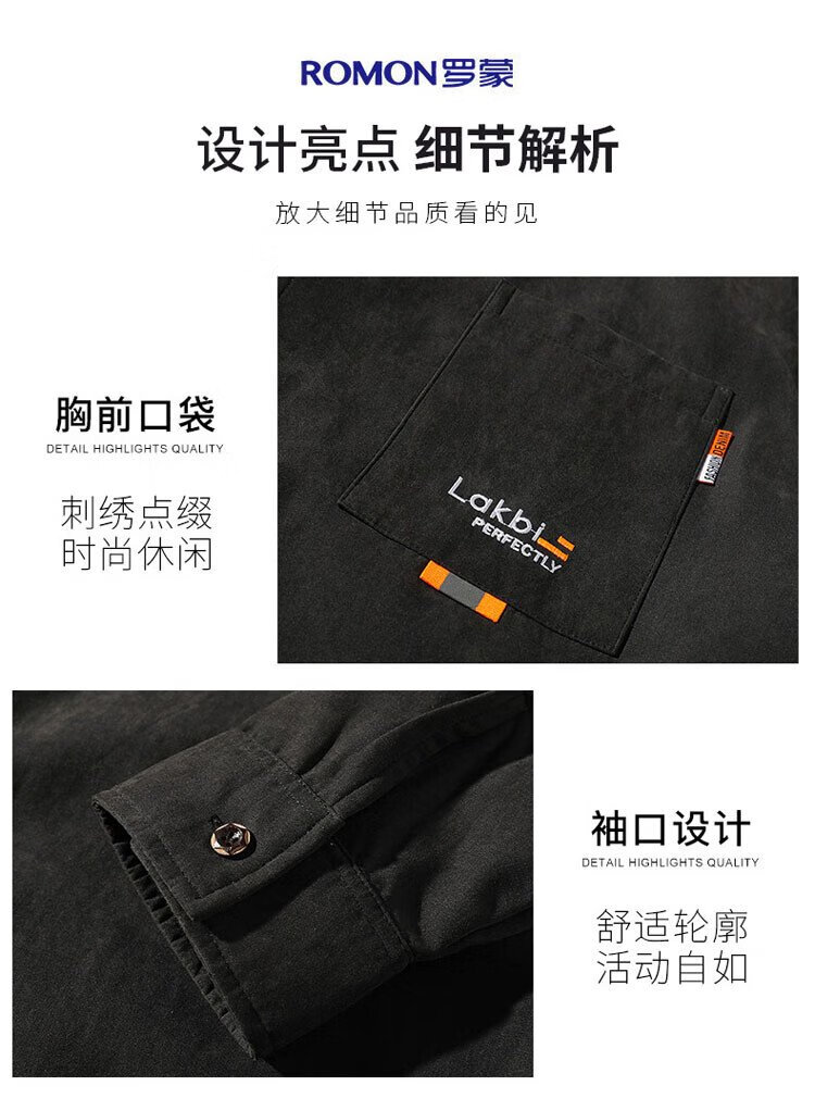 罗蒙(ROMON)长袖衬衫男春秋季潮流休闲外套男士宽松衬衣男装 黑色 XL