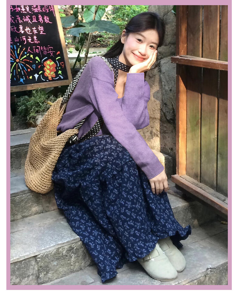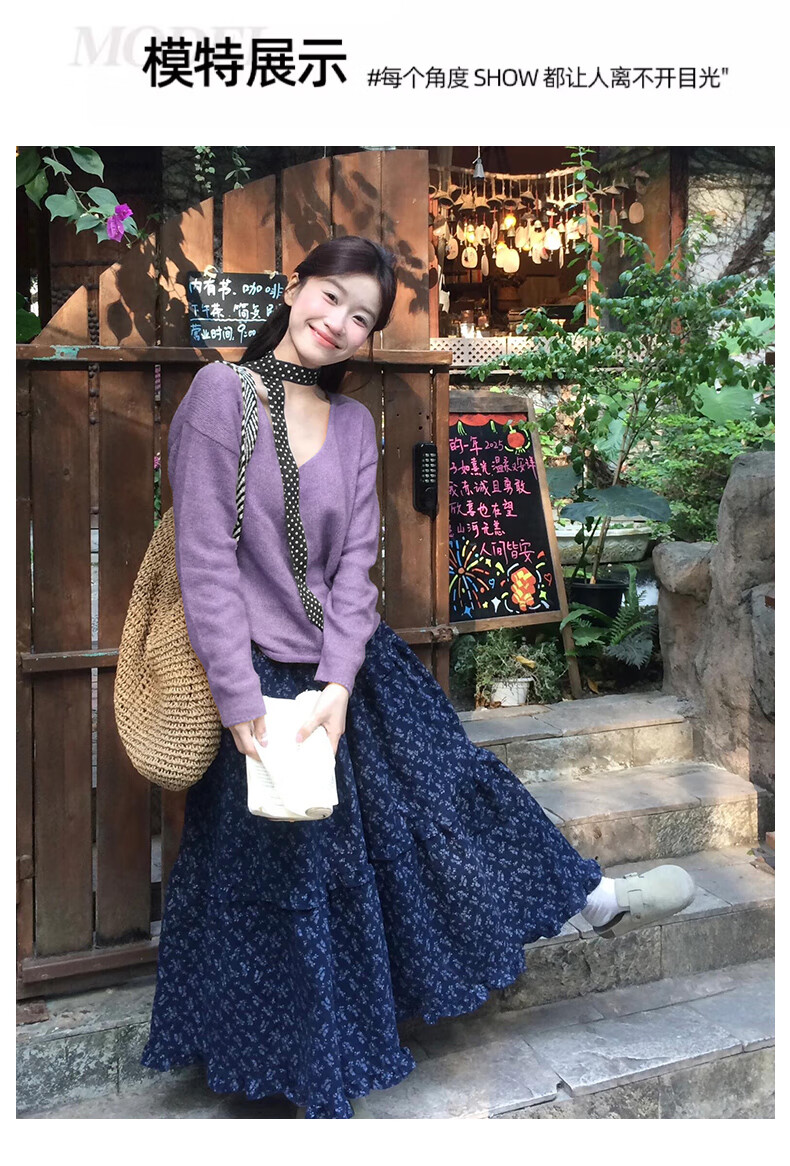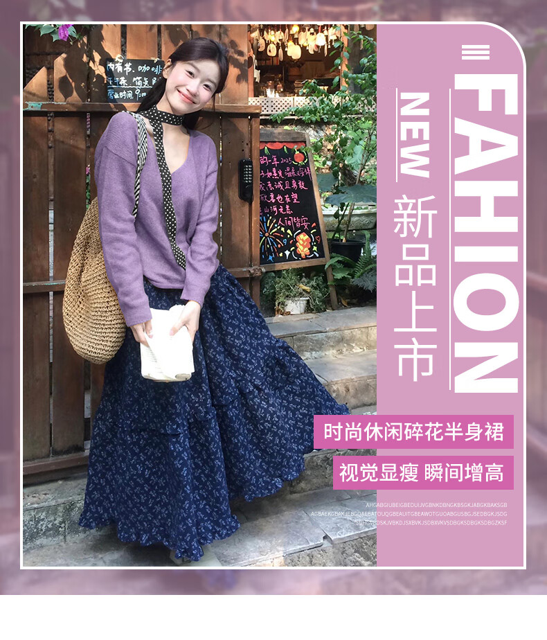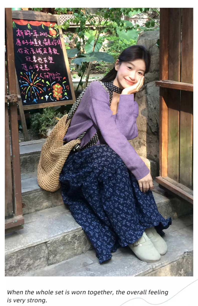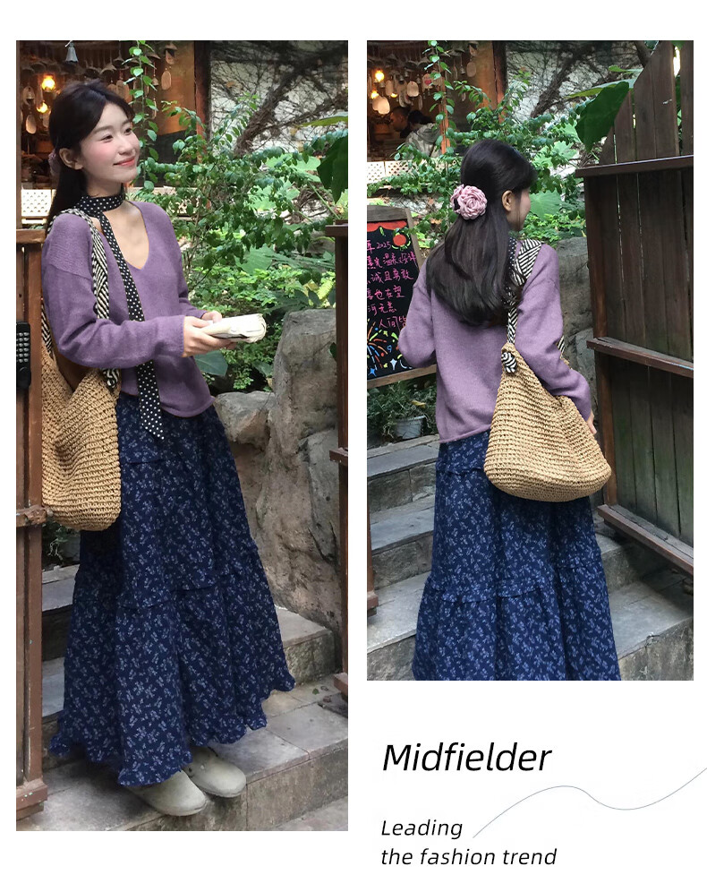 Langsha Navy Blue Floral Skirt Women's 2025 Autumn New Retro High Waist A-Line Skirt Casual Lazy Style Long Skirt