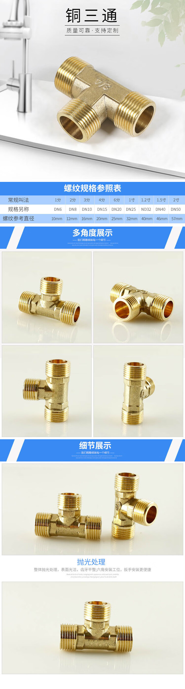 Masifo copper external wire tee joint external tooth tee pipe copper joint 4 points external wire tee (2 pieces)