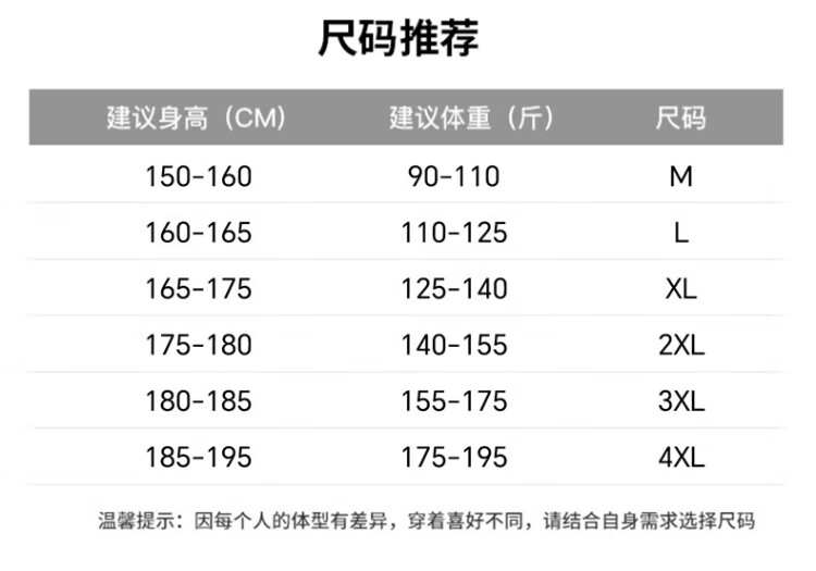China (cm) 165 / 88-90 170 / 96-98 175 / 108-110 180 / 118-122 185 / 126-130