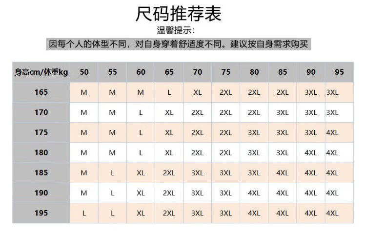 China (cm) 165 / 88-90 170 / 96-98 175 / 108-110 180 / 118-122 185 / 126-130