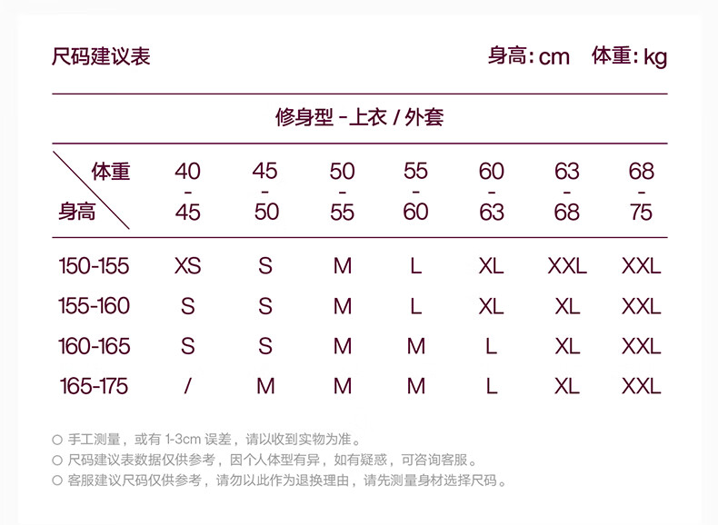 China (cm) 160-165/84-86 165-170 / 88-90 167-172 / 92-96 168-173 / 98-102 170-176 / 106-110