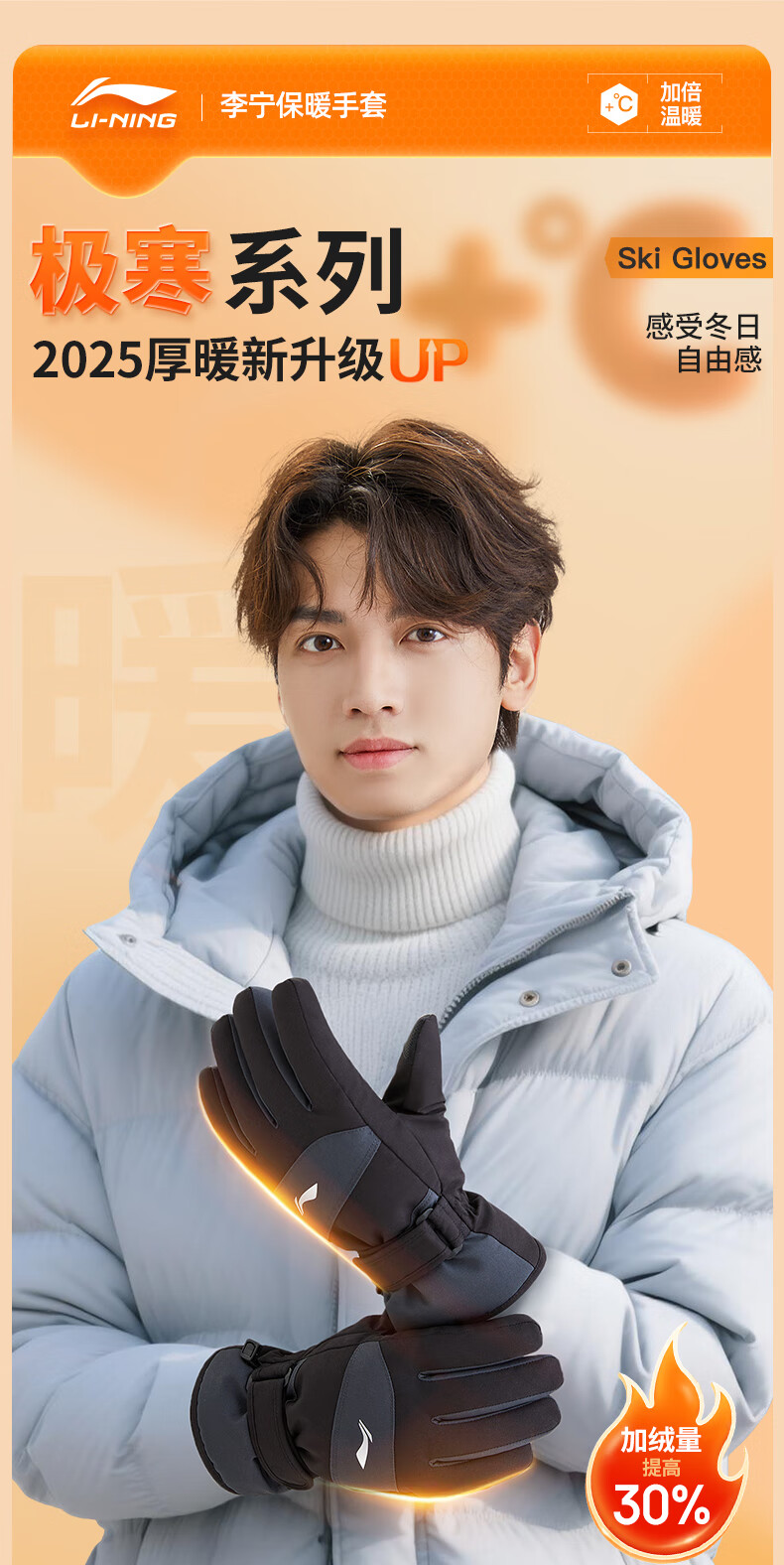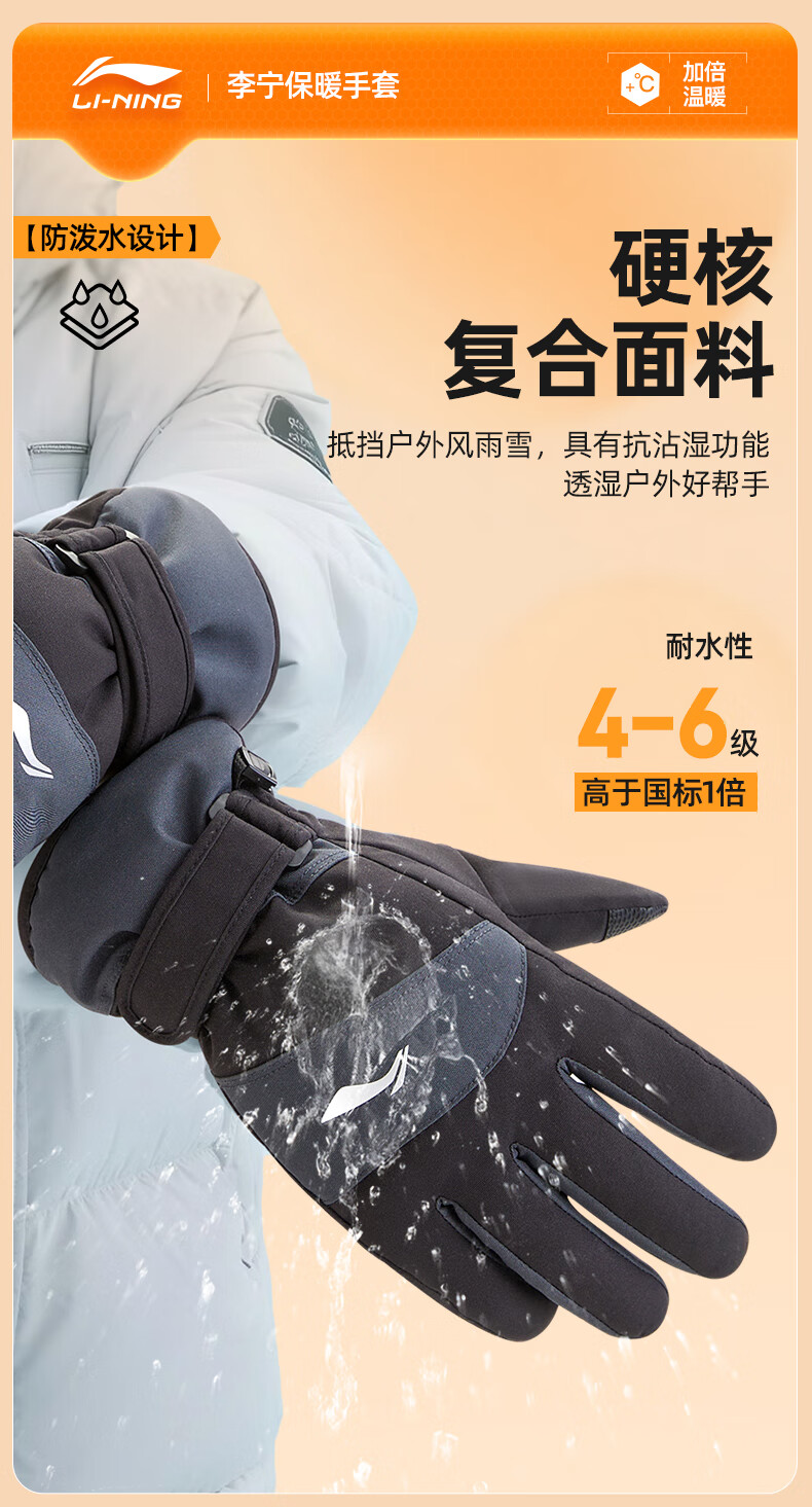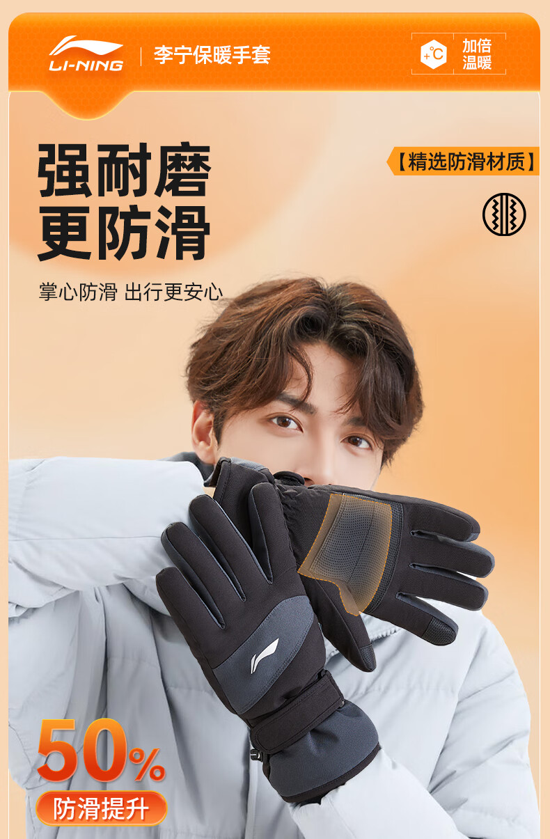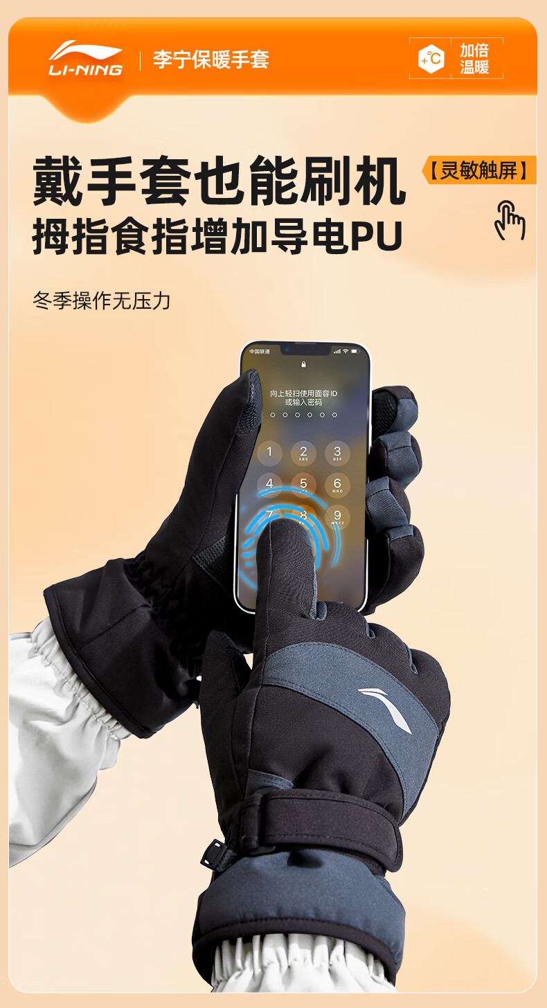 Li Ning (LI-NING) winter men's cycling gloves, skiing, cold wind protection, extra thick, warm, touch screen, waterproof, electric vehicle, motorcycle, mountaineering