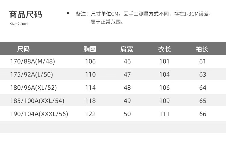 China (cm) 160-165/84-86 165-170 / 88-90 167-172 / 92-96 168-173 / 98-102 170-176 / 106-110