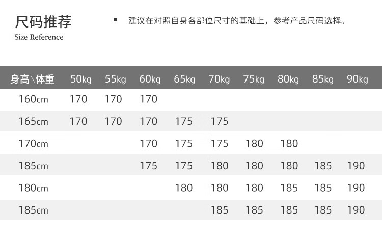 China (cm) 165 / 88-90 170 / 96-98 175 / 108-110 180 / 118-122 185 / 126-130