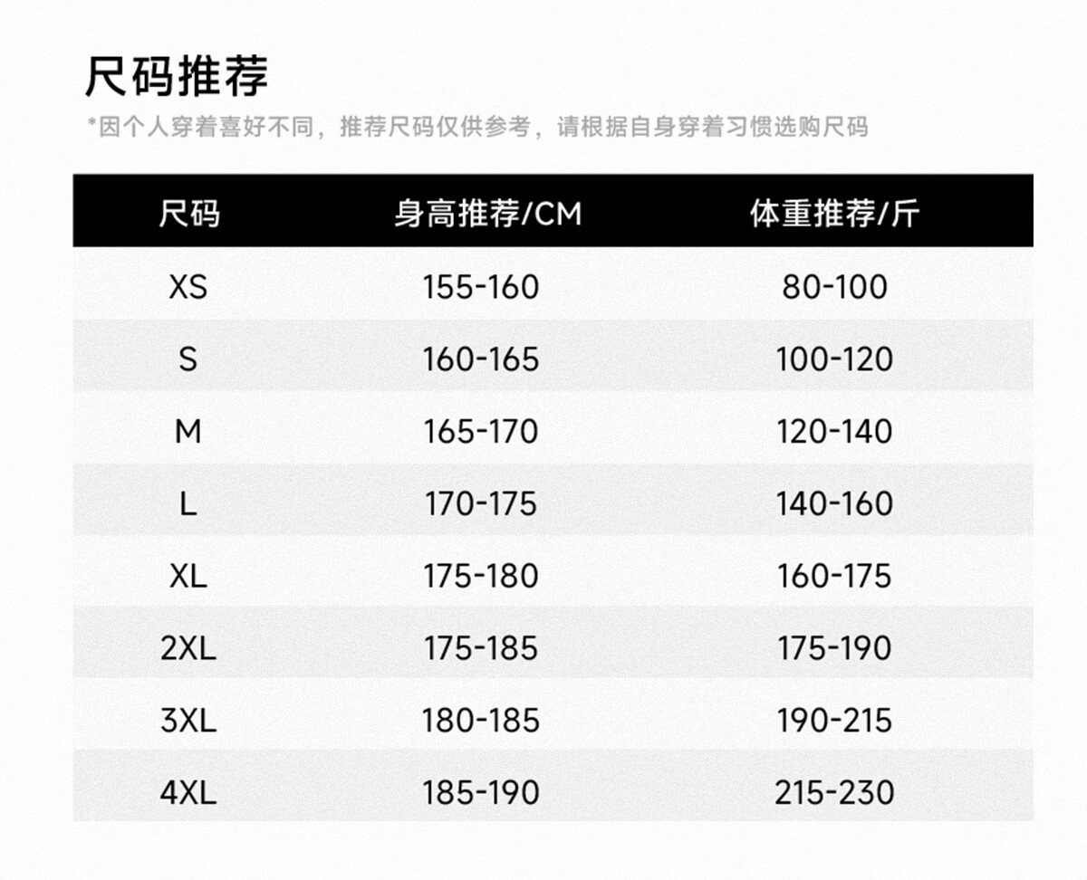 China (cm) 160-165/84-86 165-170 / 88-90 167-172 / 92-96 168-173 / 98-102 170-176 / 106-110