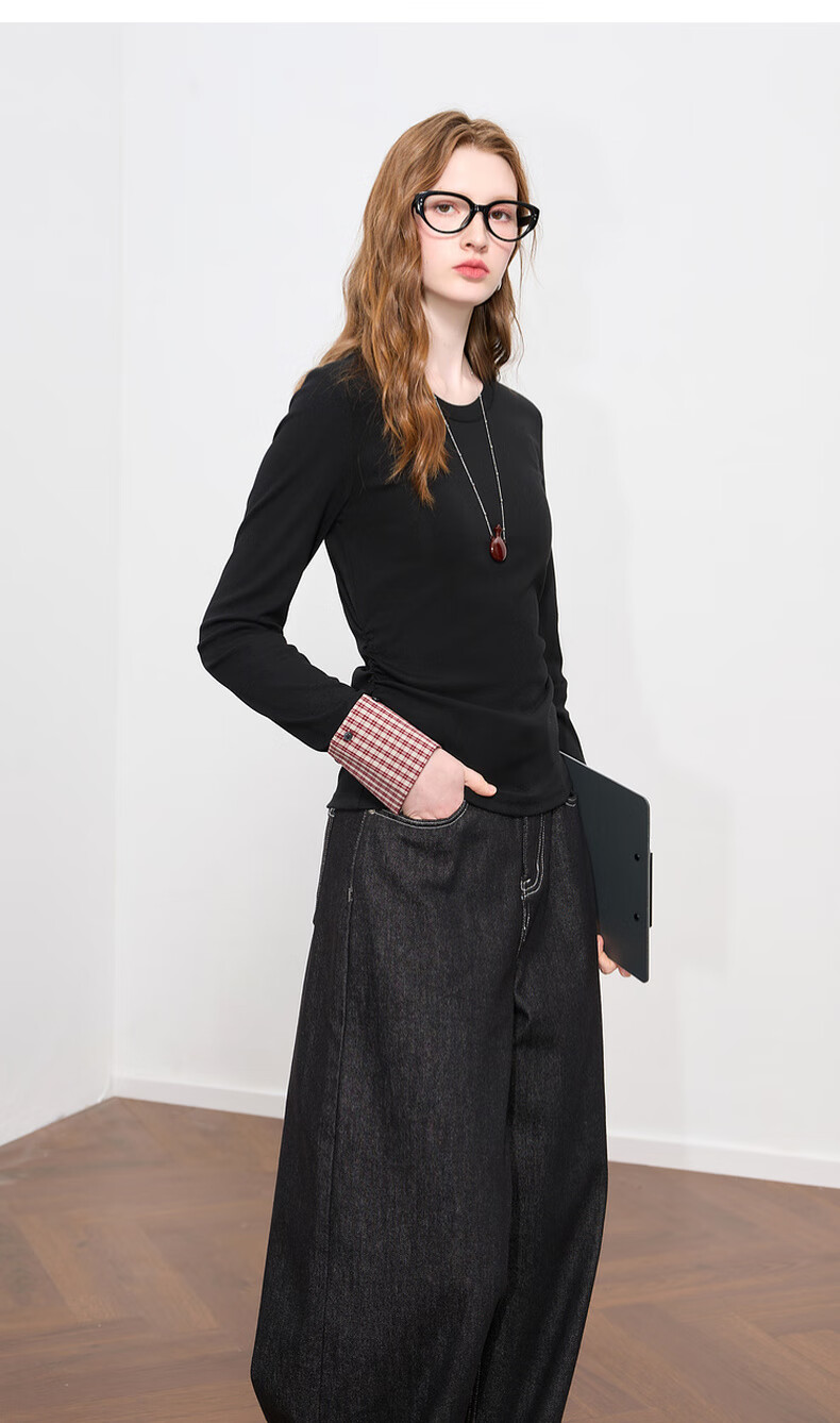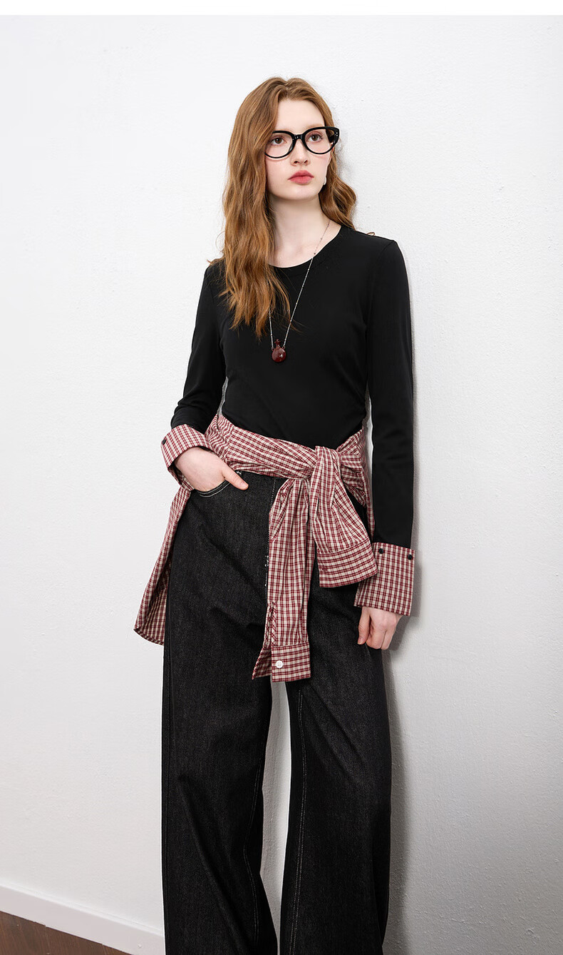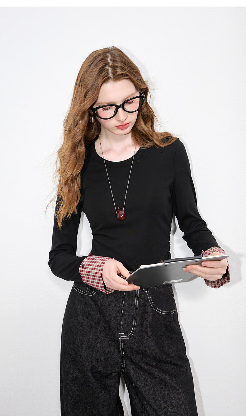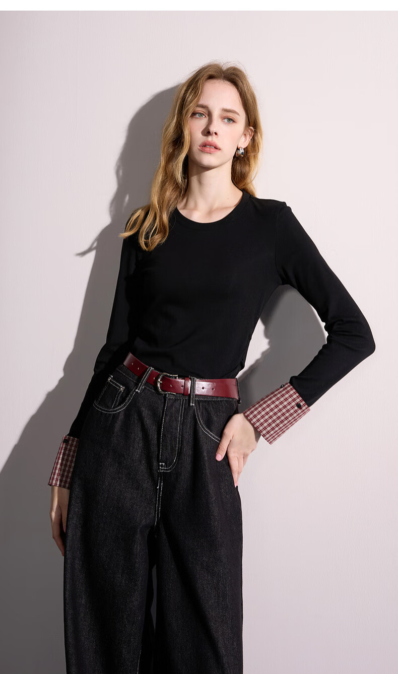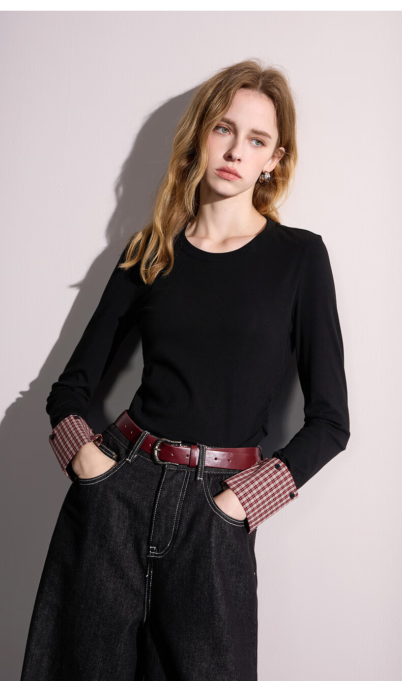 Sancai 2025 Autumn New Round Neck Long Sleeve T-Shirt Bottoming Top Right Shoulder Slim M