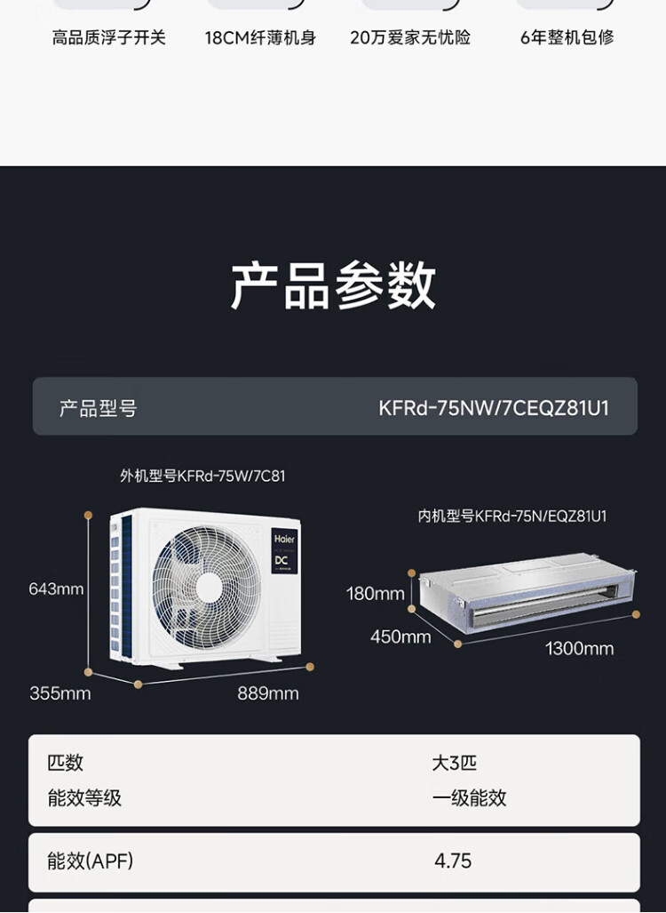 Haier Net Energy Saving Plus Central Air Conditioning Duct Unit for One Living Room, Large 3 Horsepower, First Class Energy Efficiency KFRd-75NW/7CEQZ81U1, Beijing Distribution, National Subsidy, All-inclusive Price