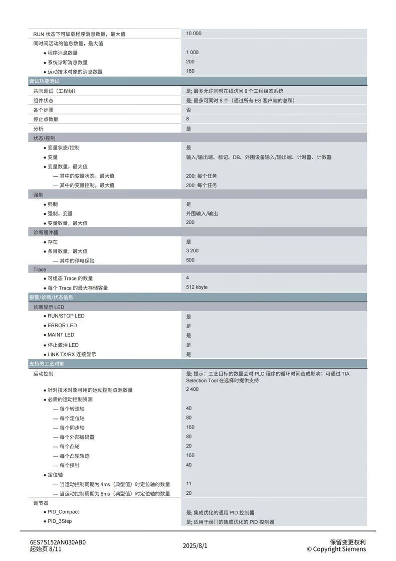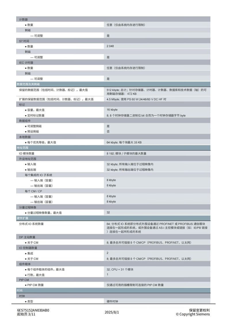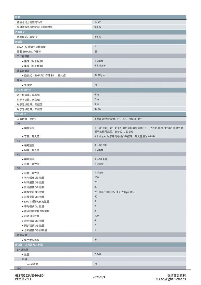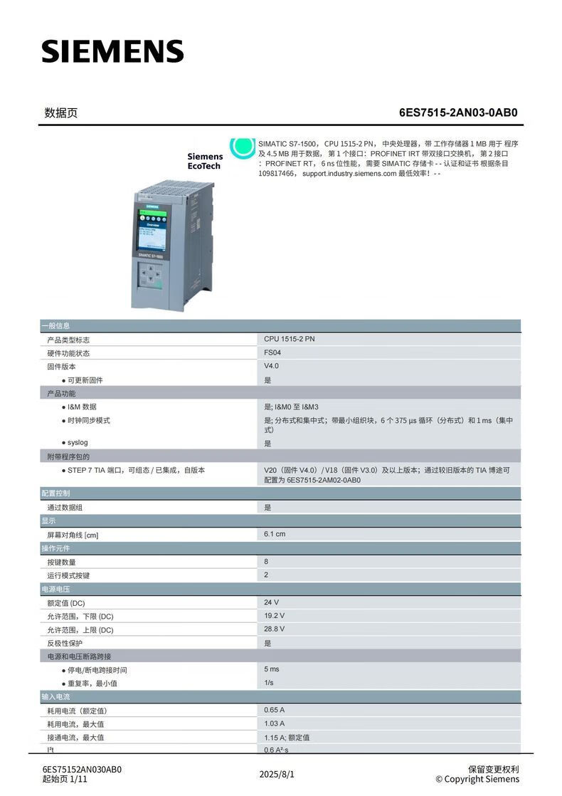 Siemens S7-1500 series CPU module standard type 6ES75152AN030AB0