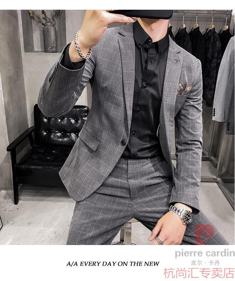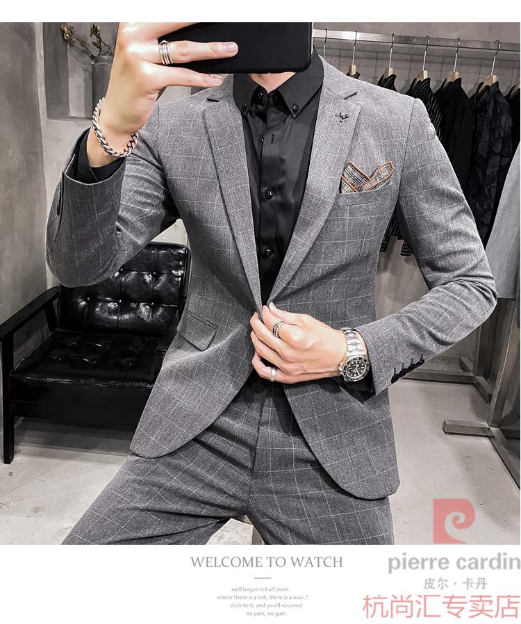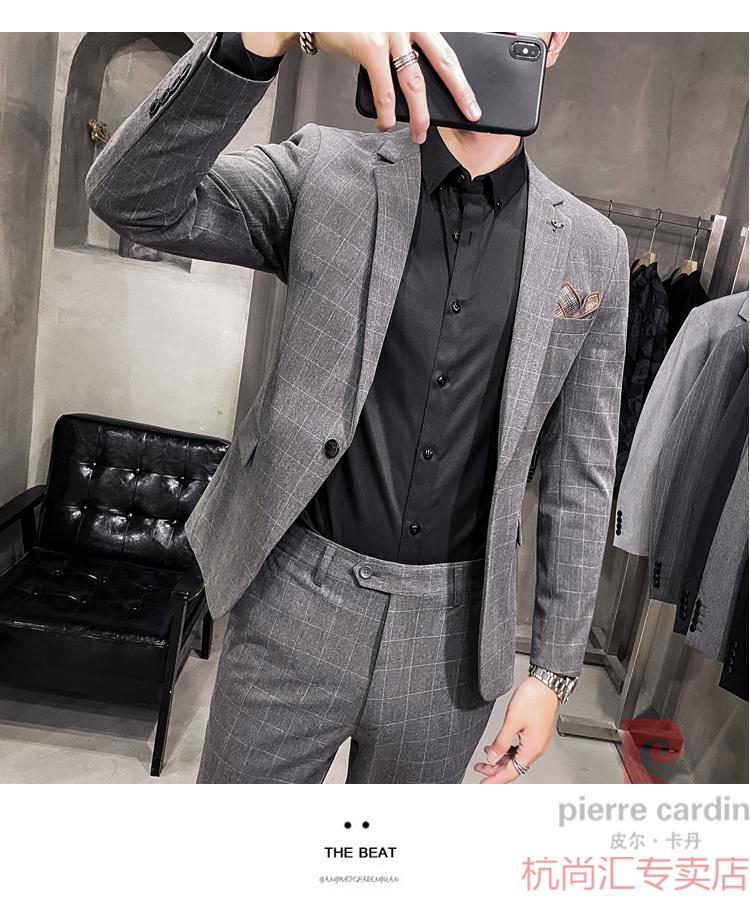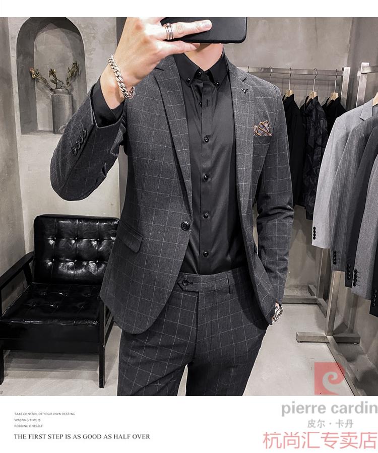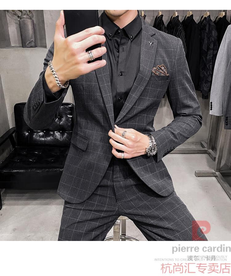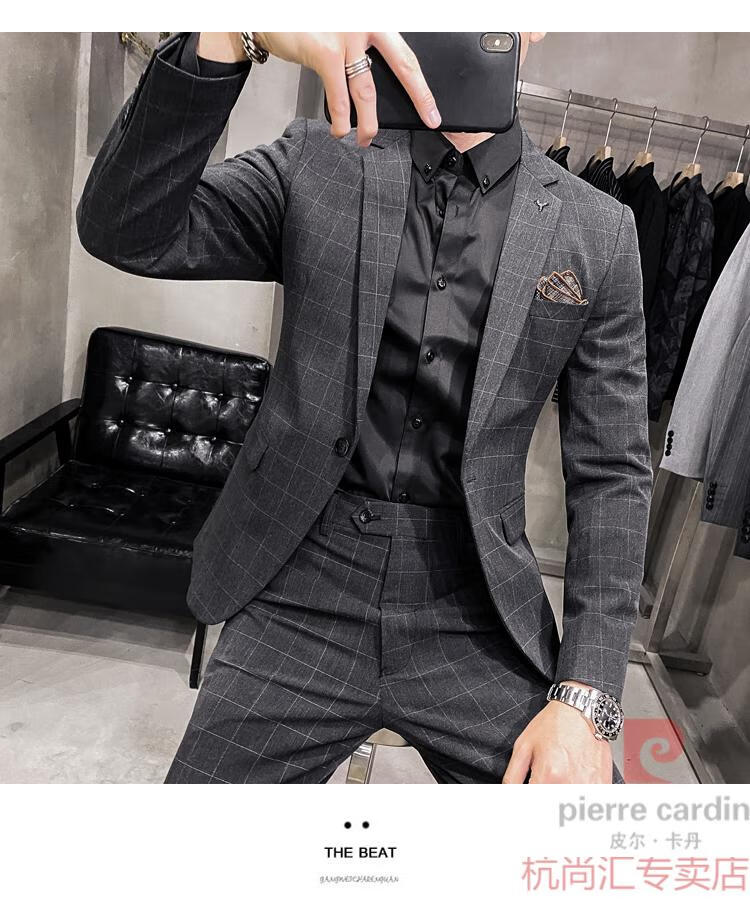 Pierre Cardin light luxury high-end brand men's fashion plaid suit men's suit youth slim British style handsome suit men's handsome casual jacket light luxury knitted dark gray suit and pants L