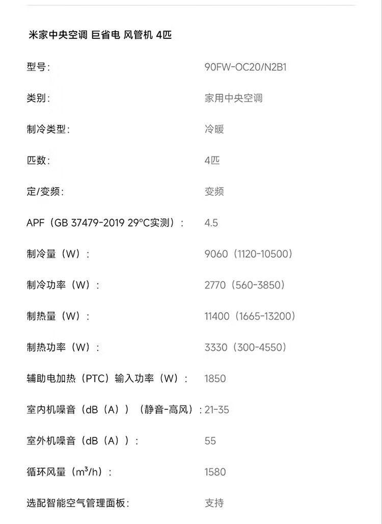 Xiaomi (MI) Mijia 4 HP, huge power saving, first-level energy efficiency, one-to-one duct machine, central air conditioner 90FW-OC20/N2B1 2026 new model