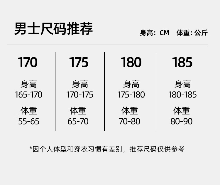 China (cm) 165 / 88-90 170 / 96-98 175 / 108-110 180 / 118-122 185 / 126-130