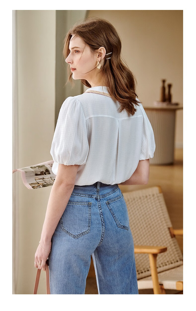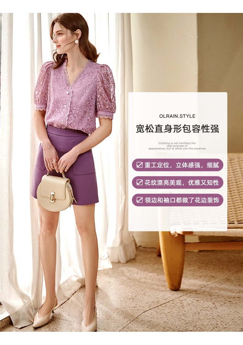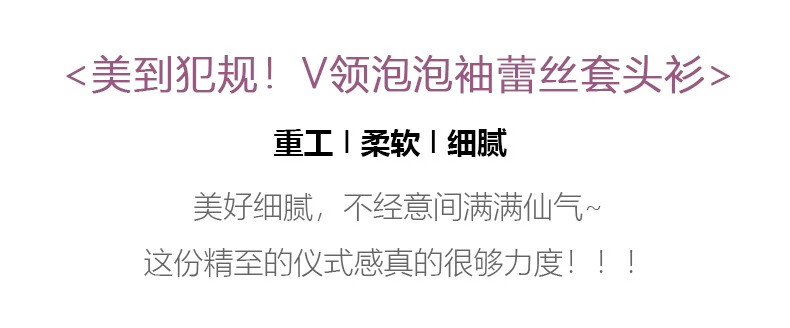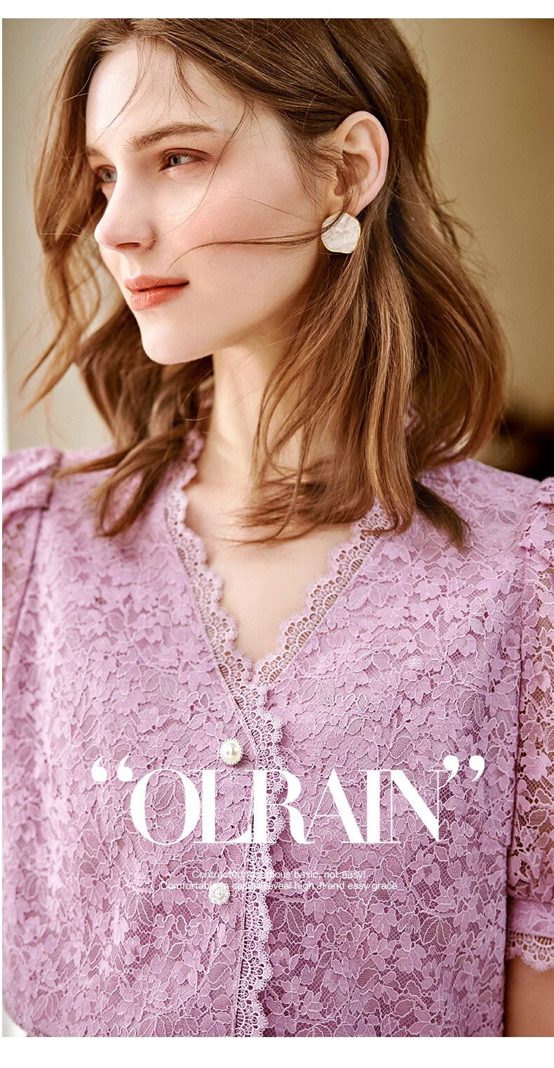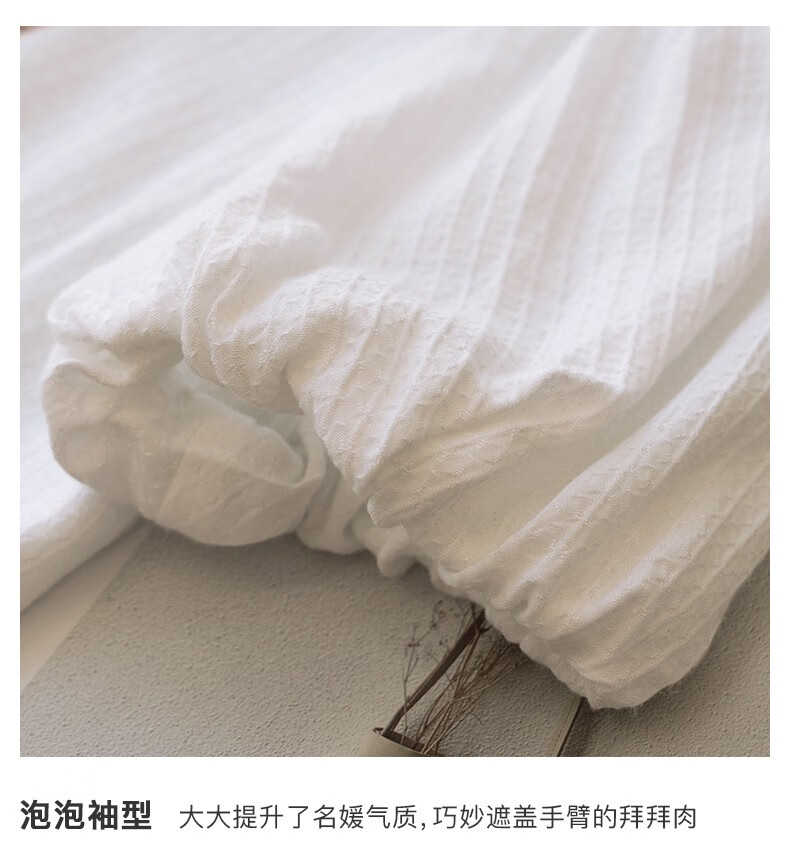 Olrain Autumn and Summer French Lace Shirt V-neck Puff Sleeve Cardigan Western Style Loose Top White S 155/80A