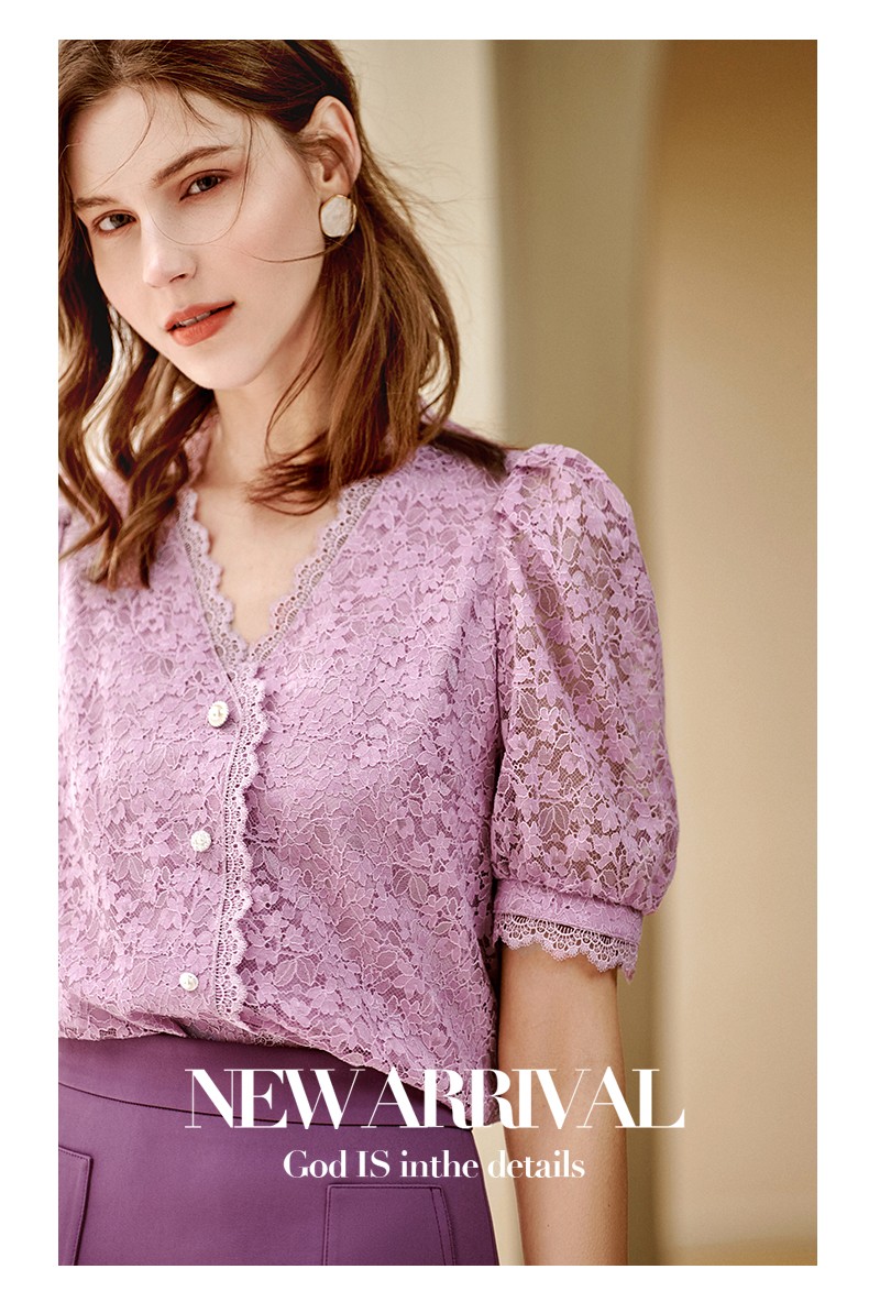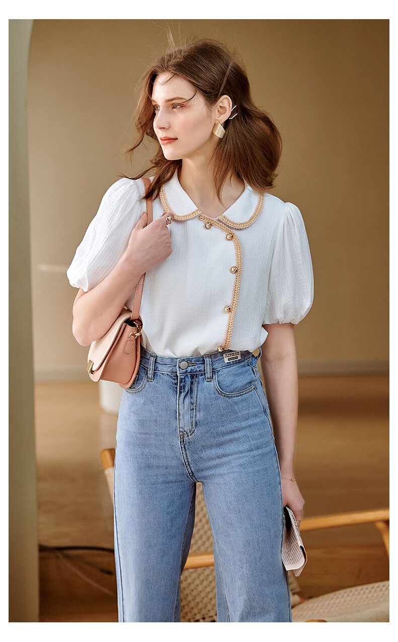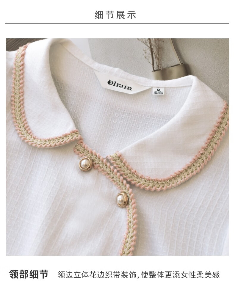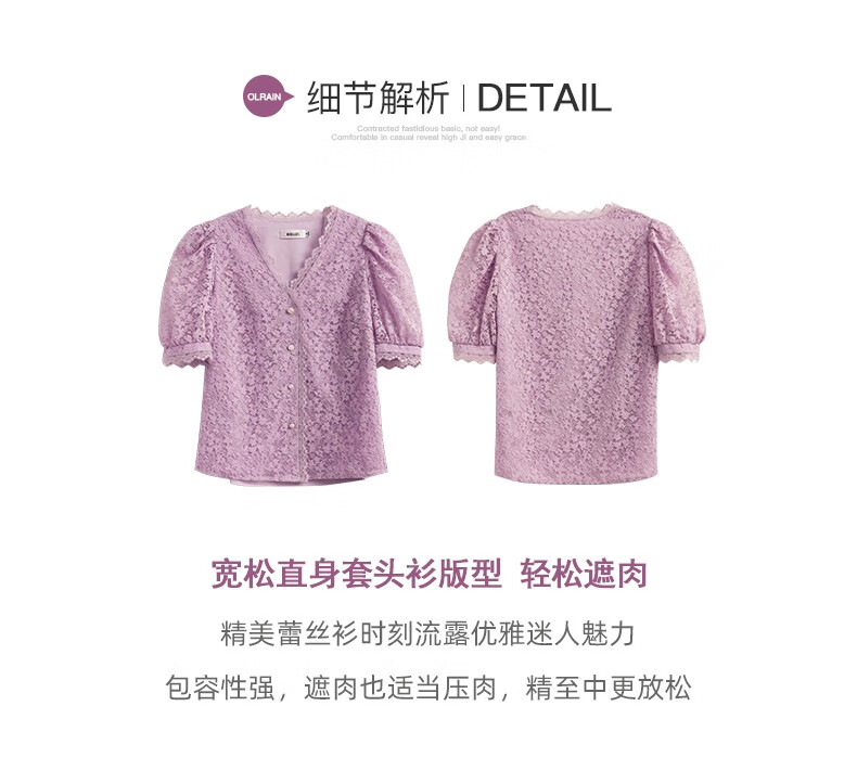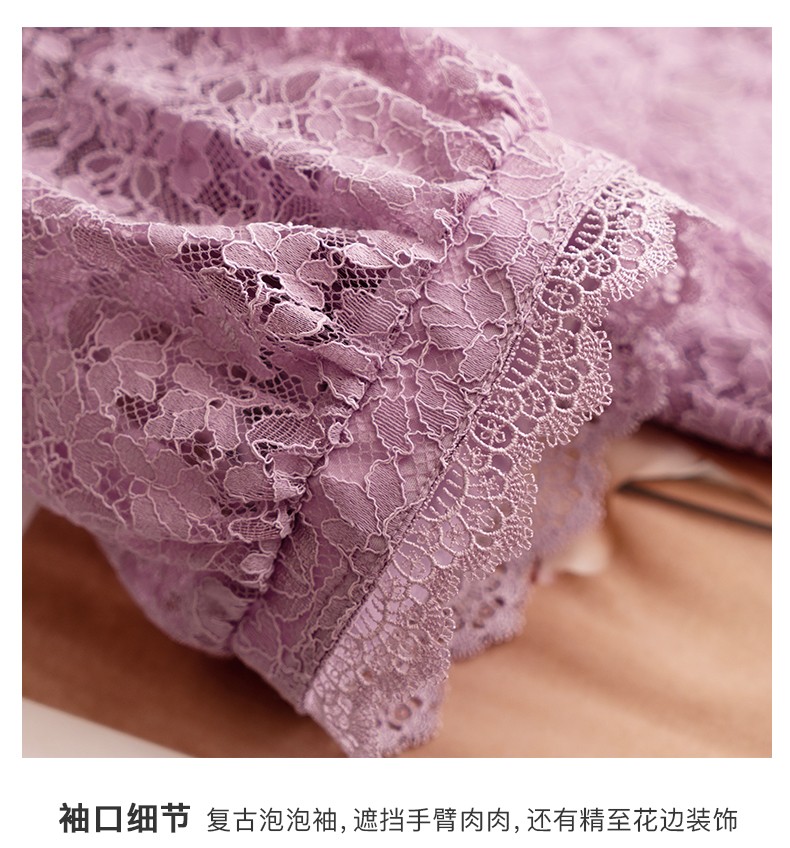 Olrain Autumn and Summer French Lace Shirt V-neck Puff Sleeve Cardigan Western Style Loose Top White S 155/80A
