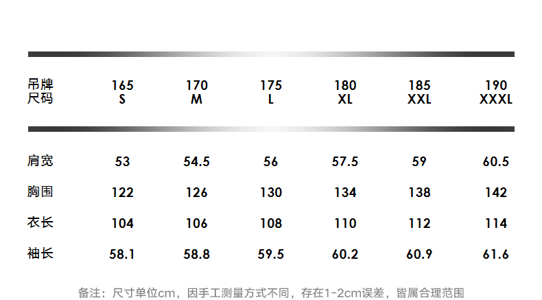 China (cm) 165 / 88-90 170 / 96-98 175 / 108-110 180 / 118-122 185 / 126-130