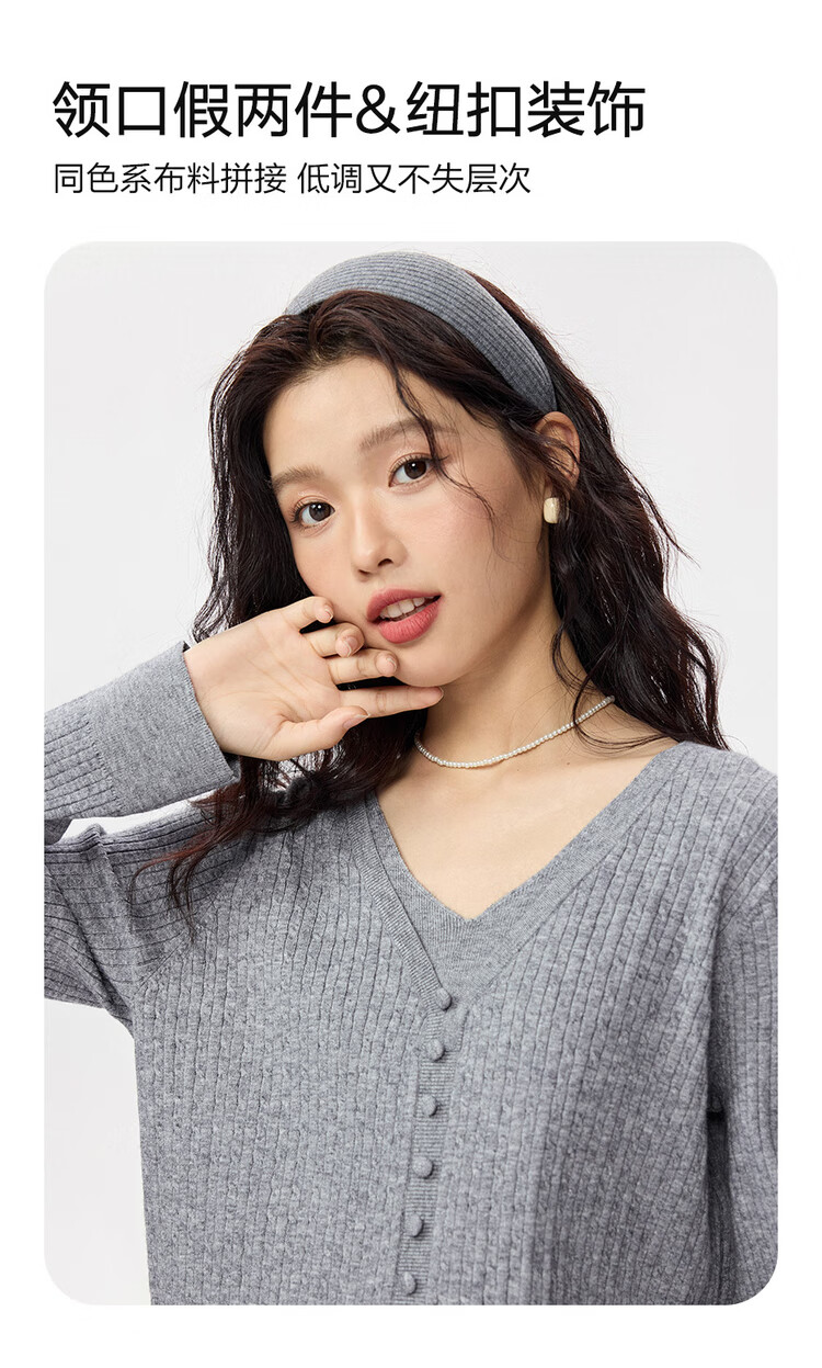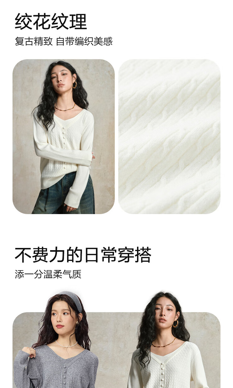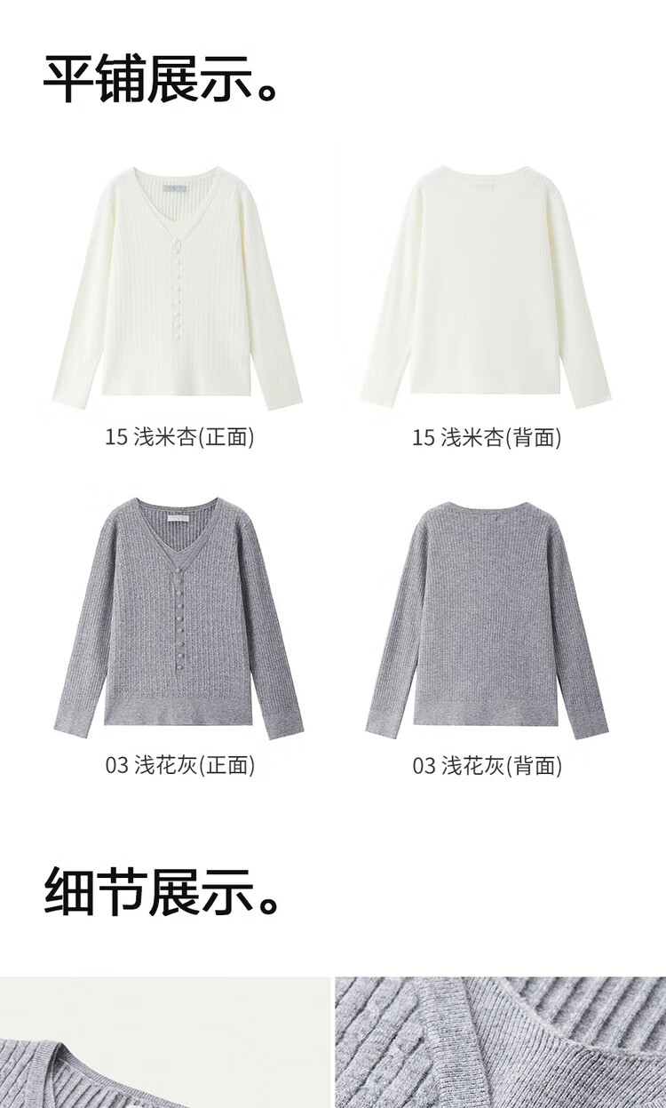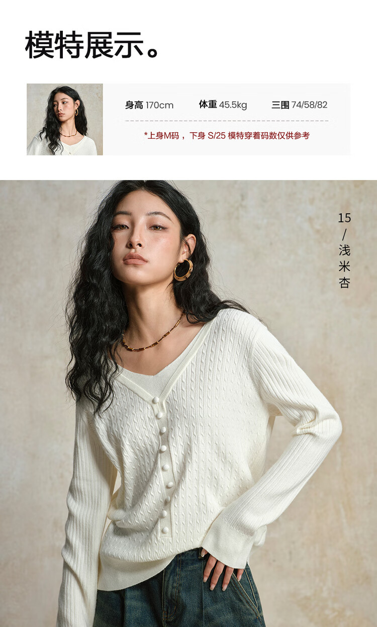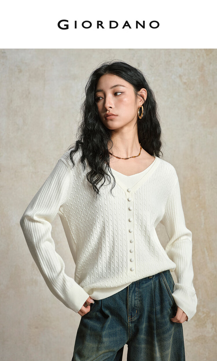 Giordano cable pattern sweater women's autumn and winter V-neck button decoration fake two-piece sweater 13355777