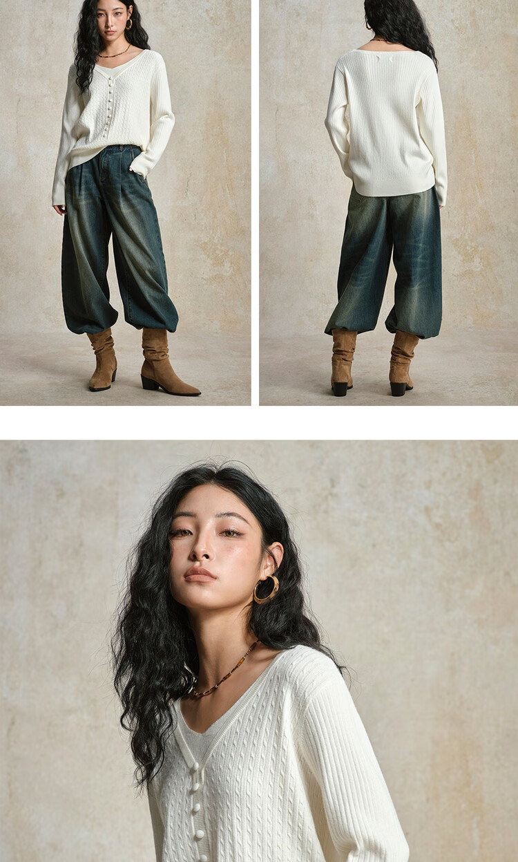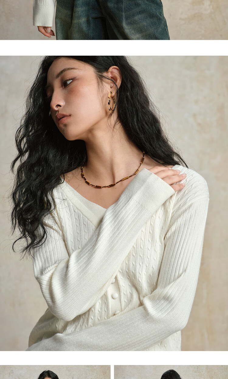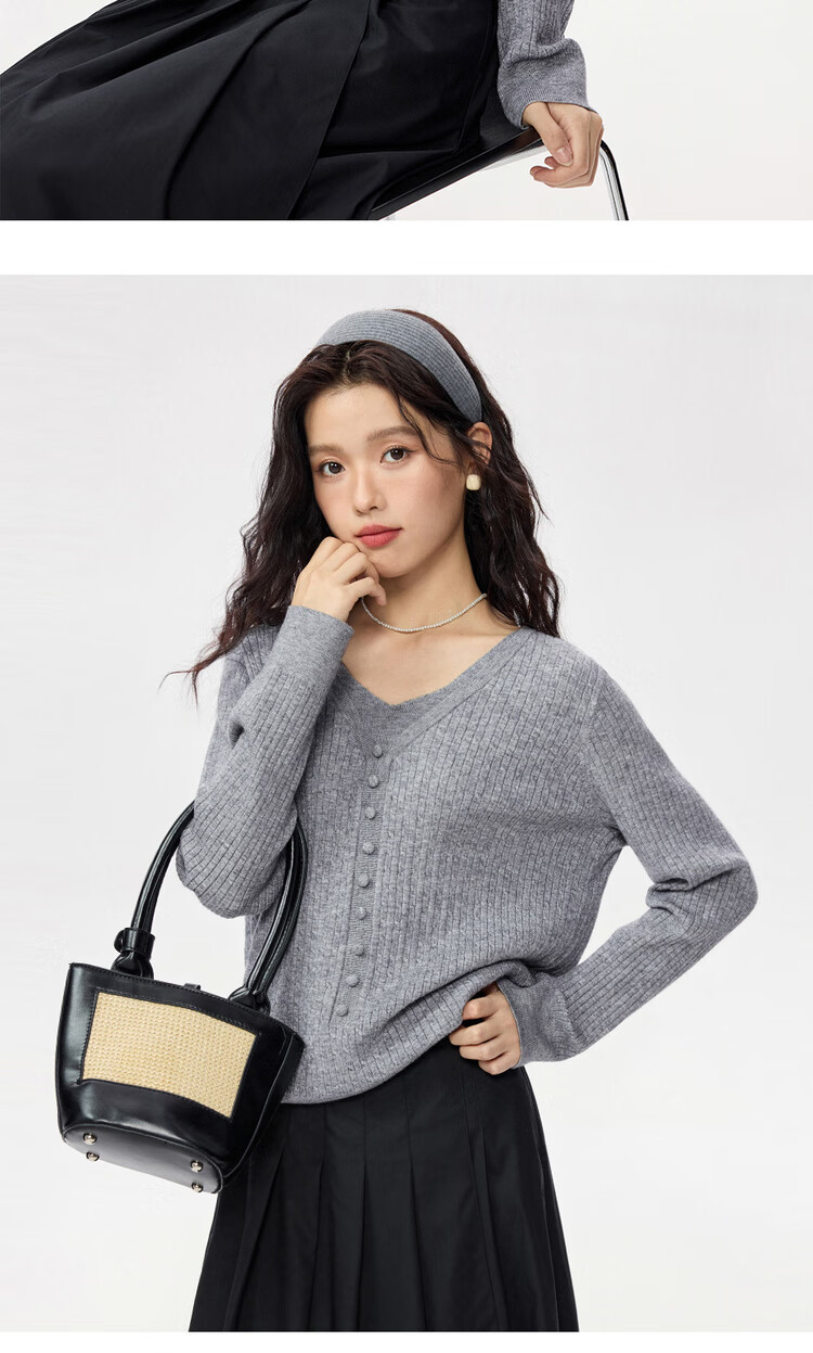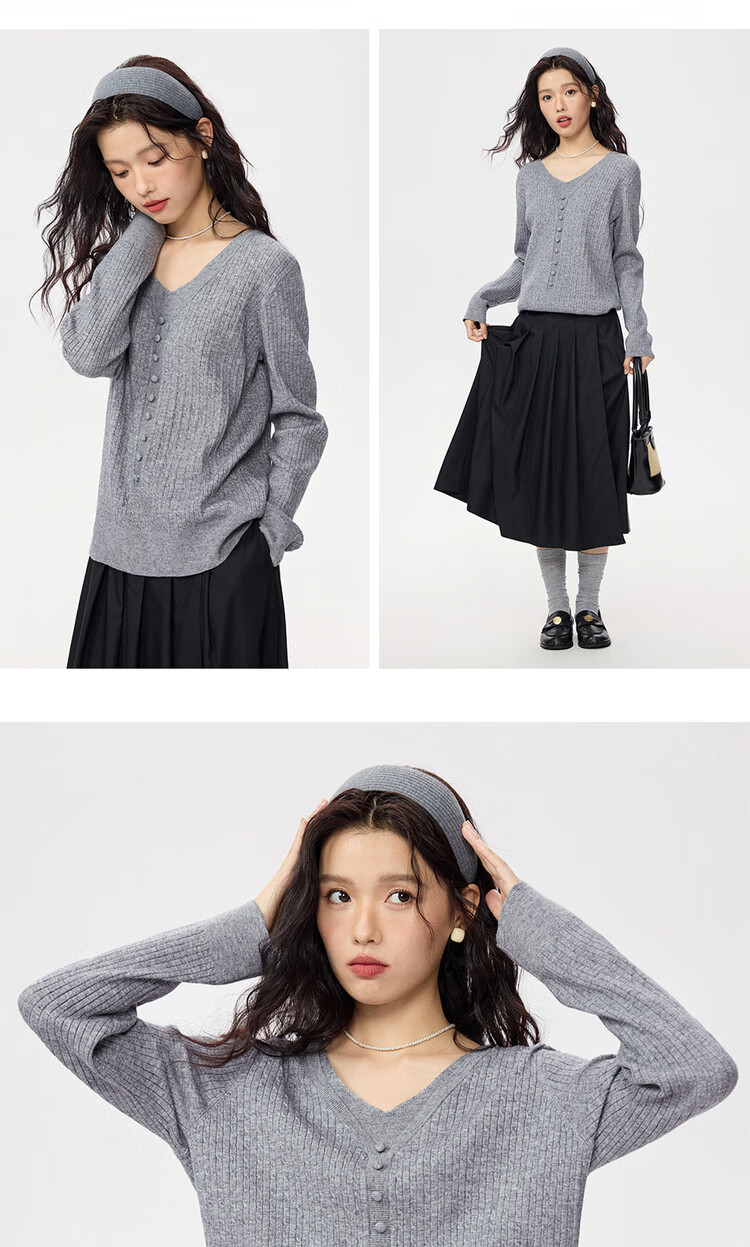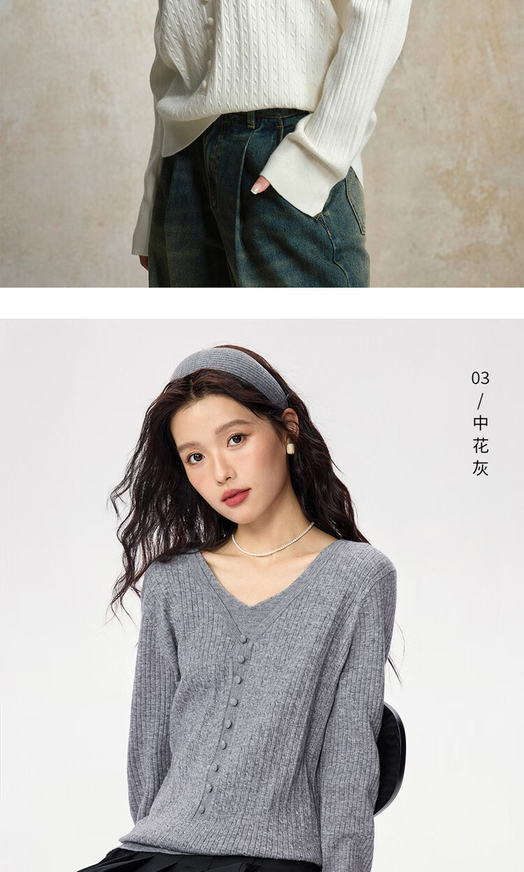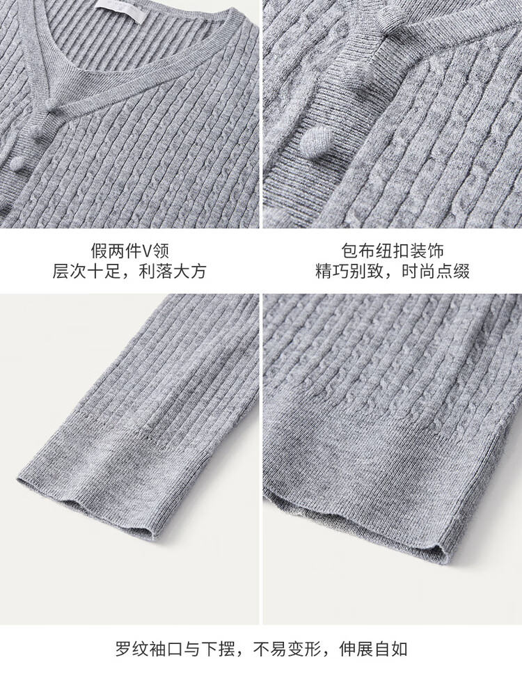 Giordano cable pattern sweater women's autumn and winter V-neck button decoration fake two-piece sweater 13355777