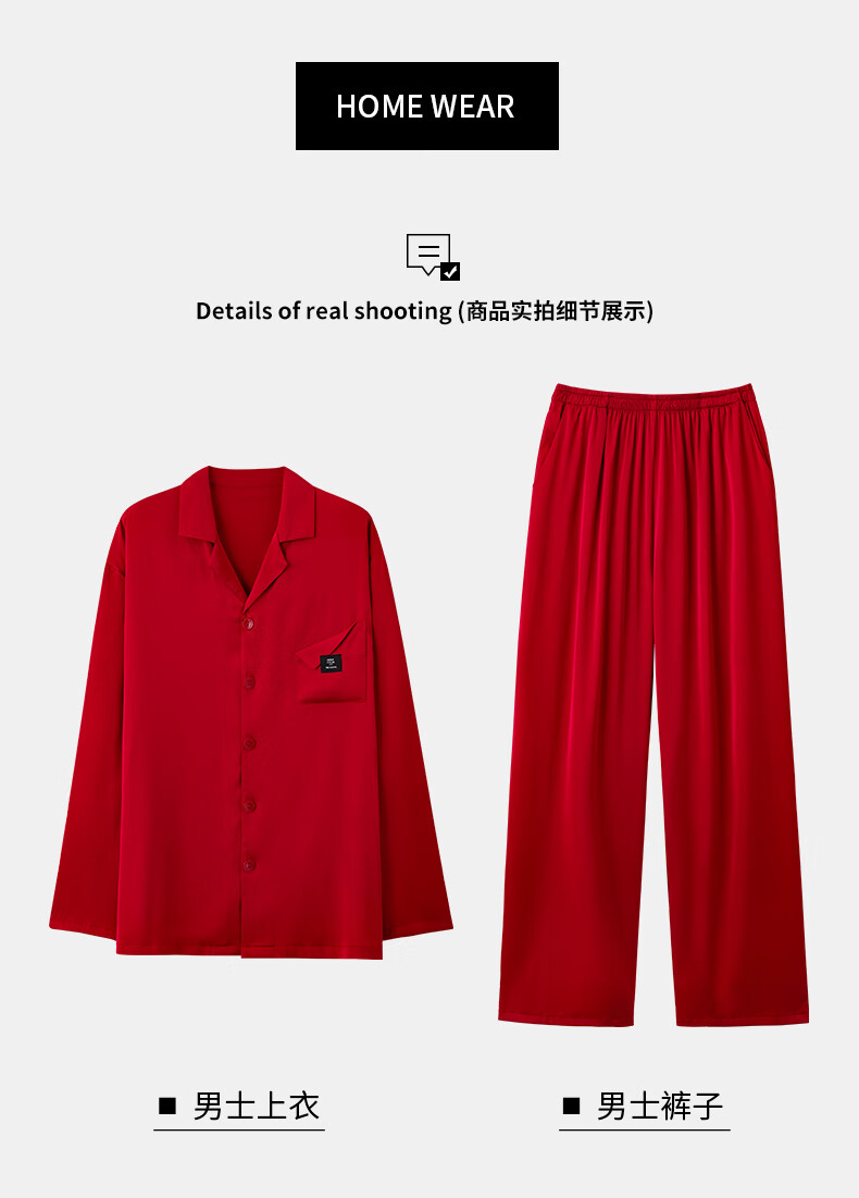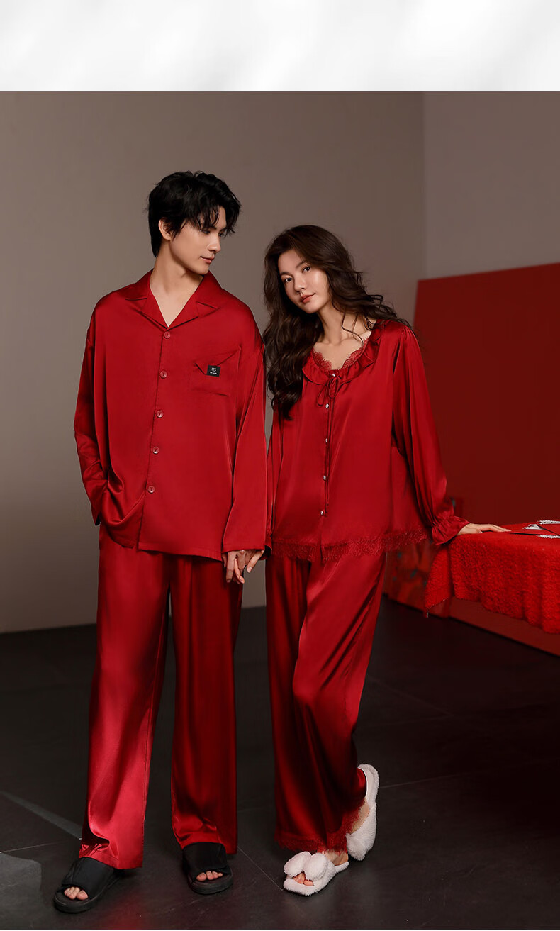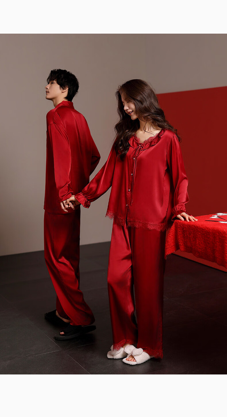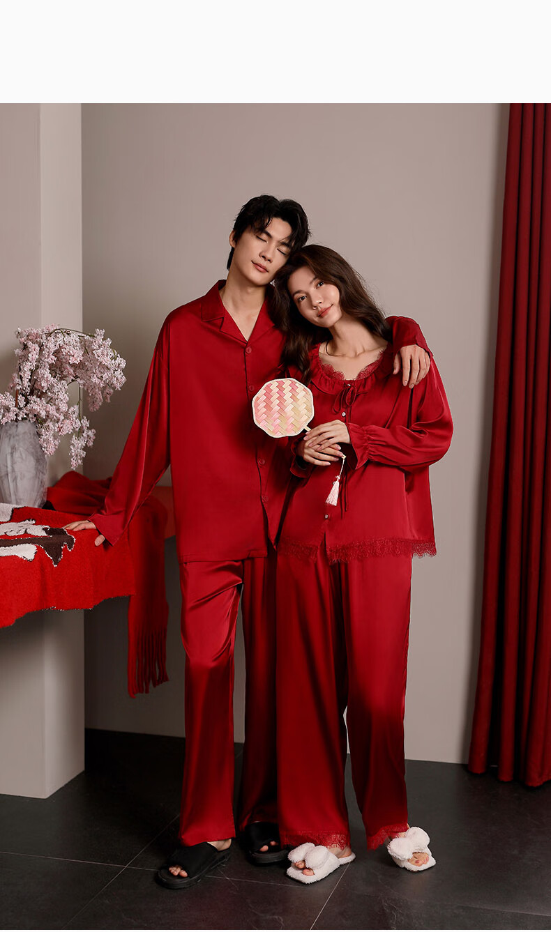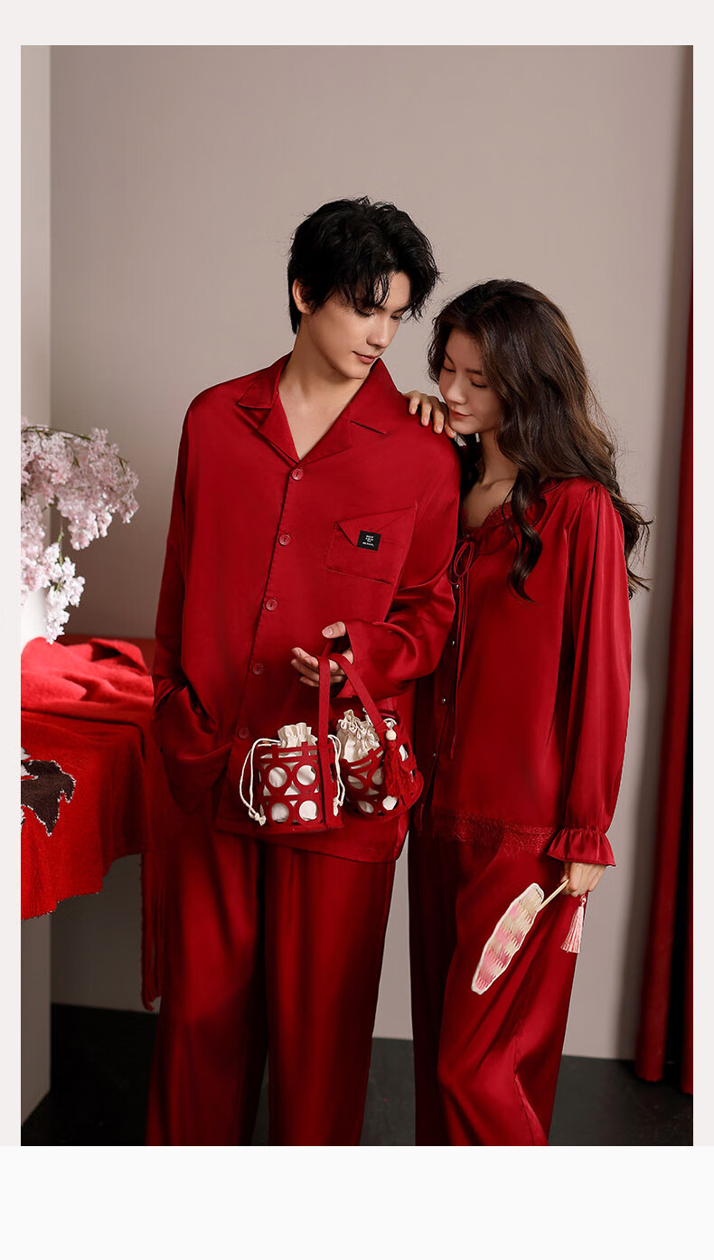 Caramella red pajamas wedding newlywed home clothes suit bride groom ice silk men and women pair spring and autumn couple pajamas