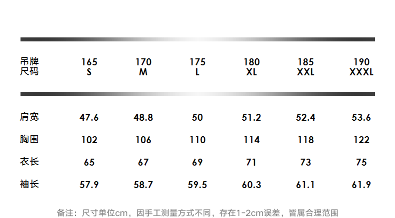 China (cm) 165 / 88-90 170 / 96-98 175 / 108-110 180 / 118-122 185 / 126-130