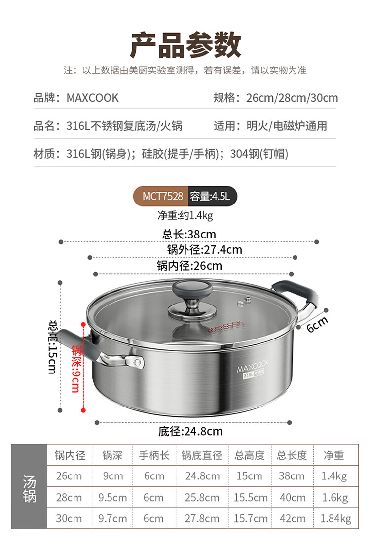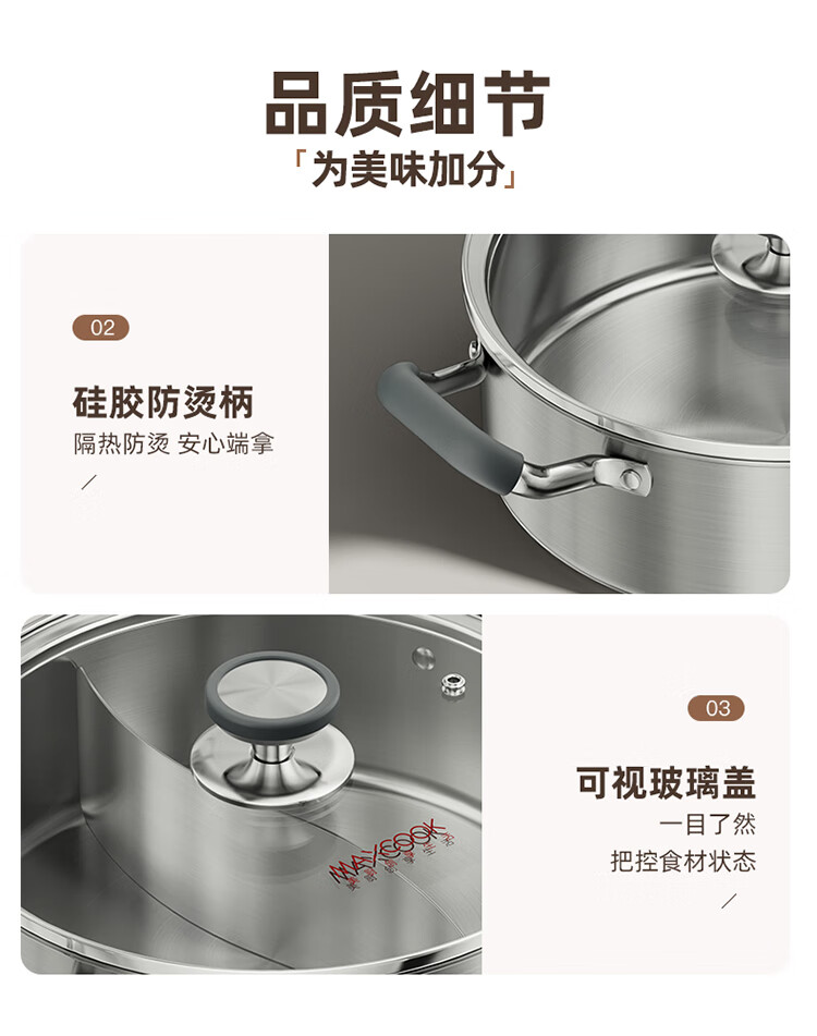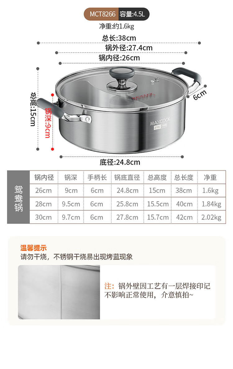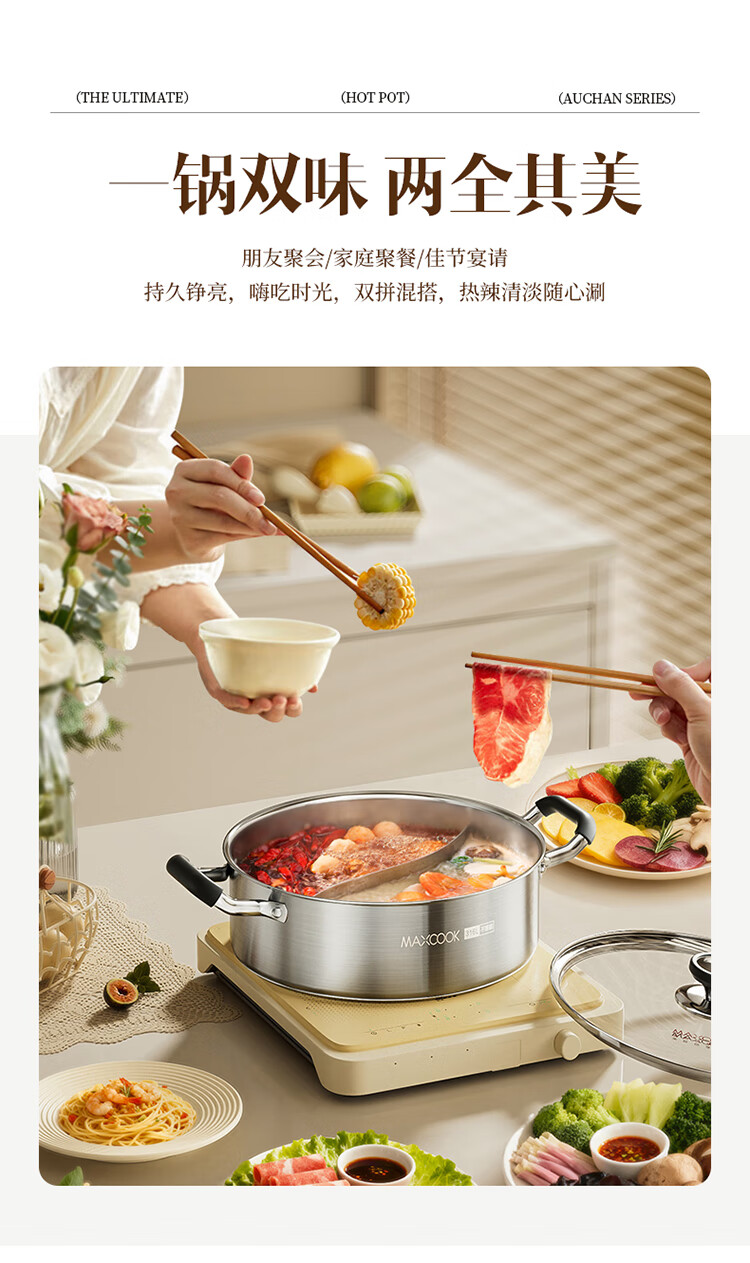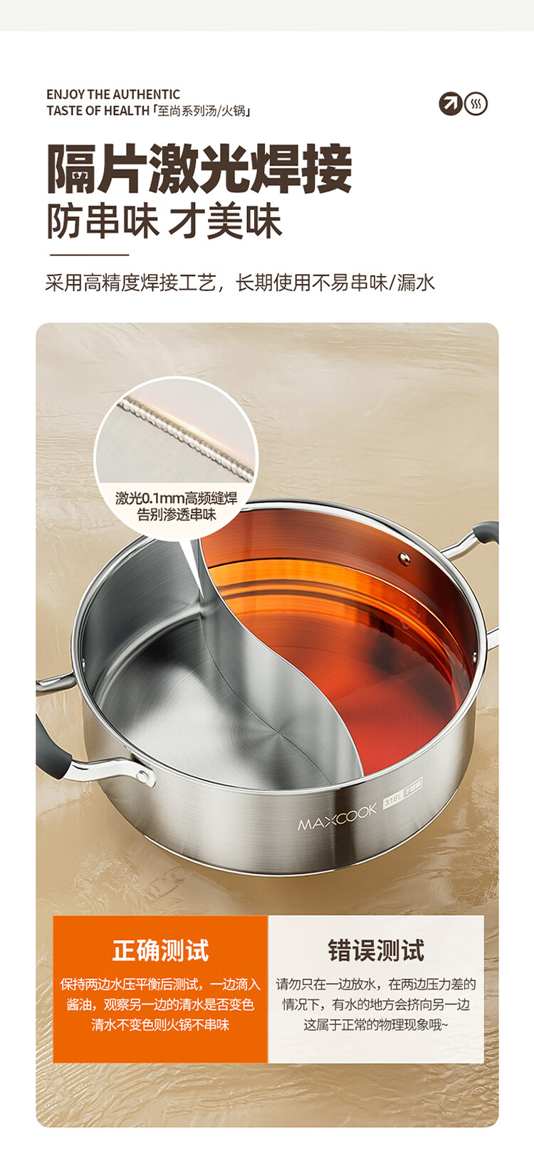 Maxcook 316L stainless steel mandarin duck hot pot 28cm soup pot hot pot with double bottom and lid gas induction cooker universal MCT8273