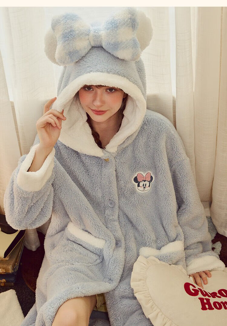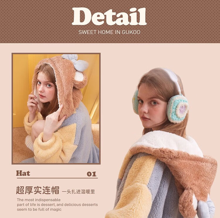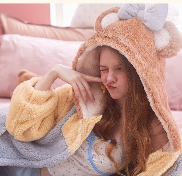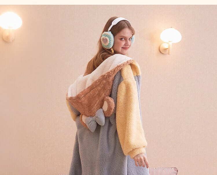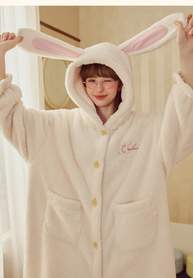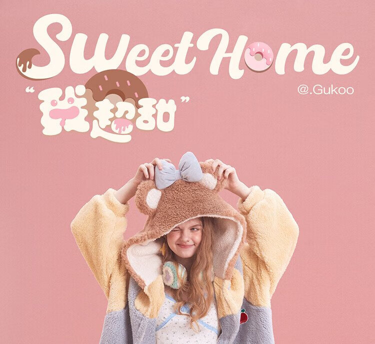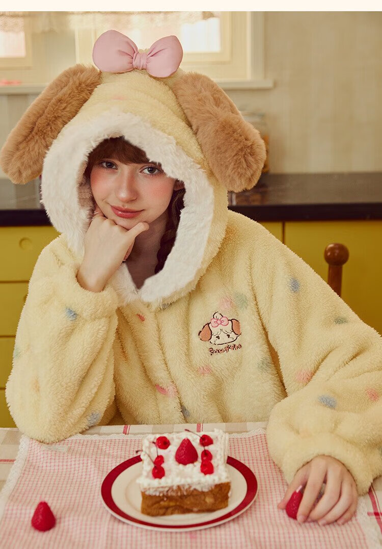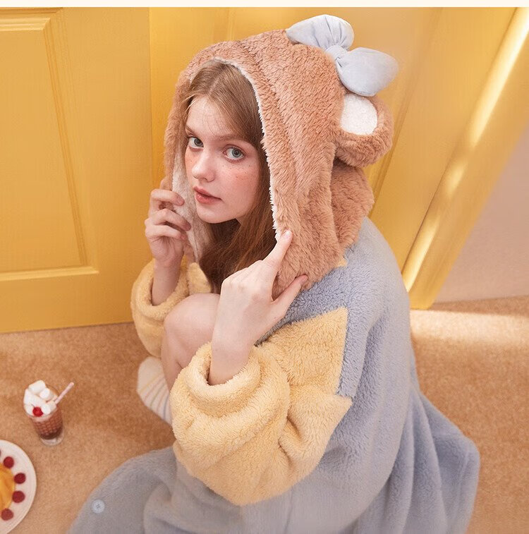 Gukoo Pajamas Women's Winter New Variety of Cute Women's Home Clothes Warm Hooded Cartoon Pajamas Custard M