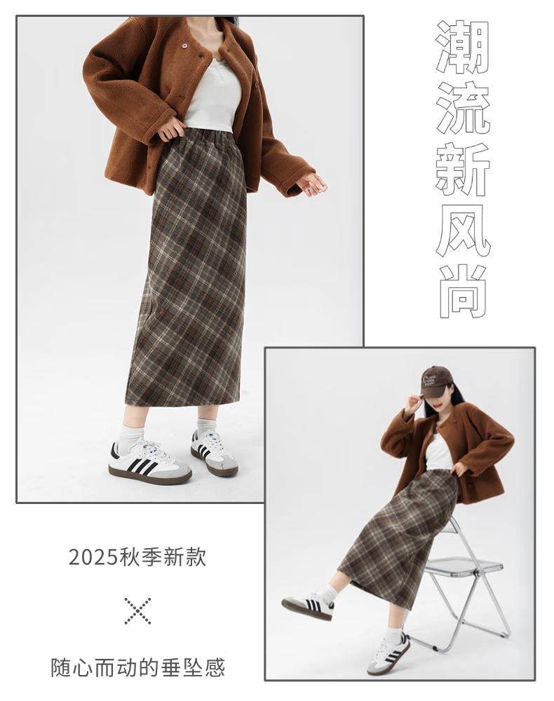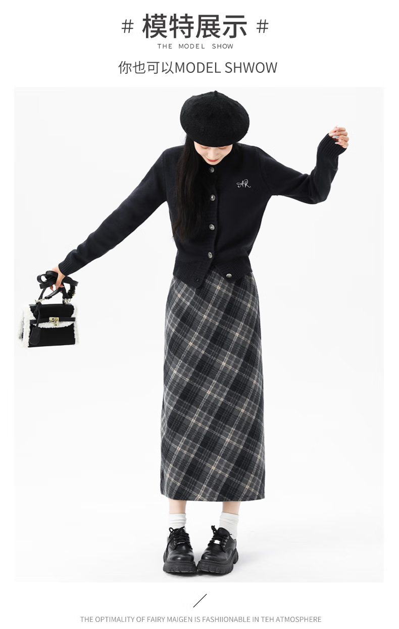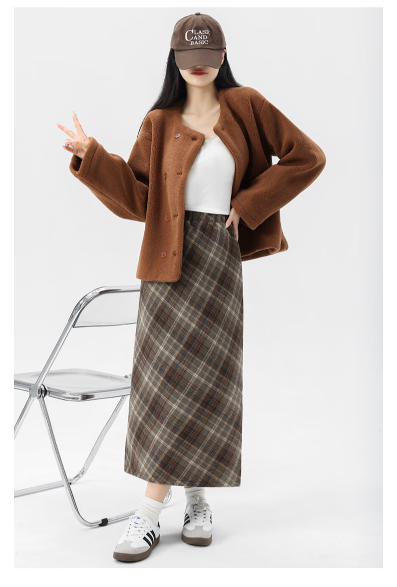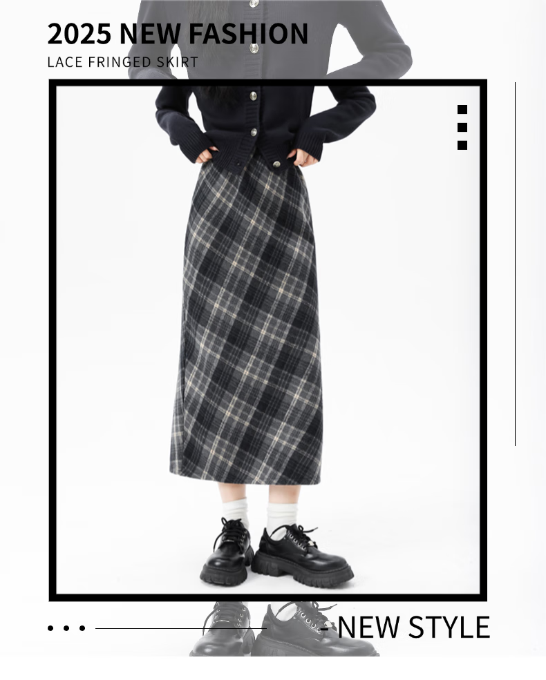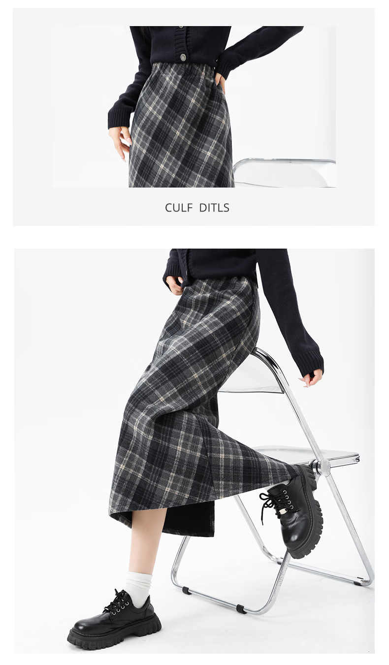 MJ STYLE woolen plaid skirt women's 2025 new spring and autumn high waist slimming slit hip mid-length skirt Khaki L