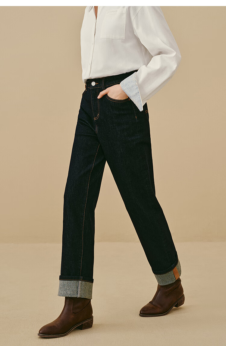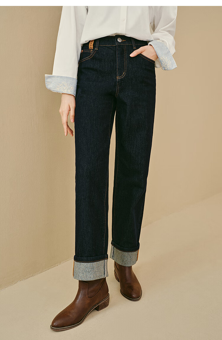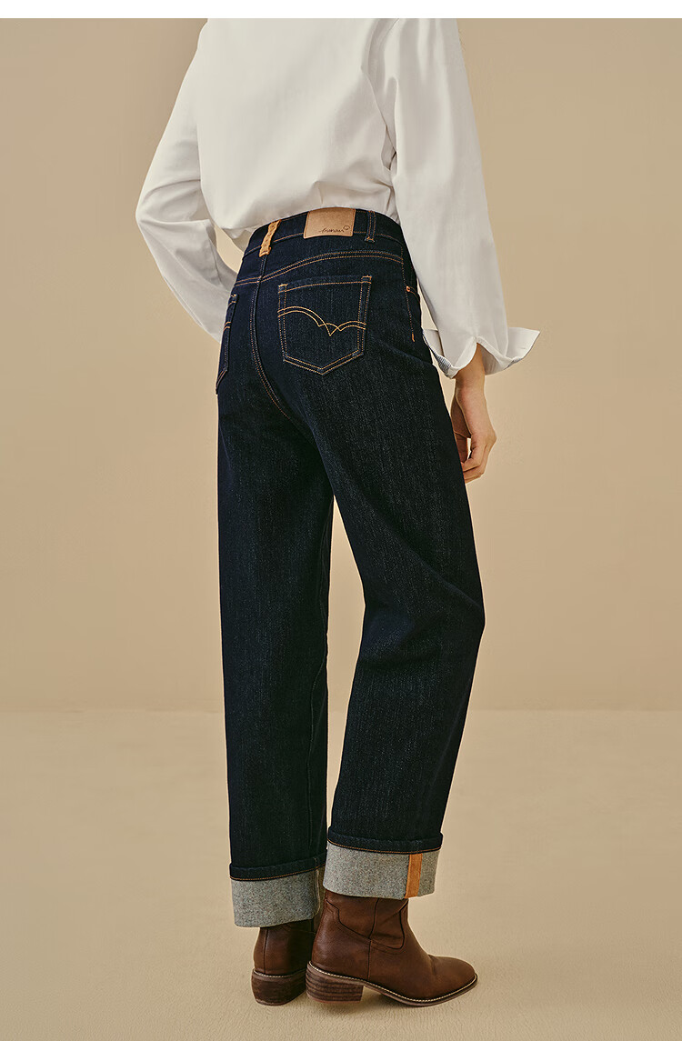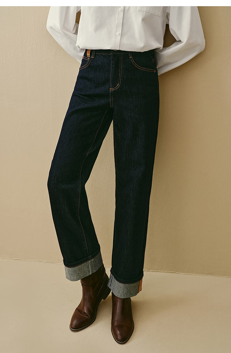 Inman Original Color Velvet Straight Jeans 2025 Winter Women's New Cuffed High Waist Trousers Dark Denim Blue 27